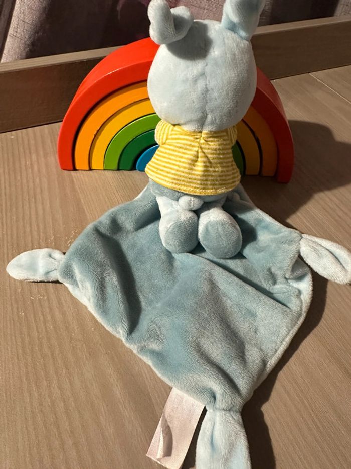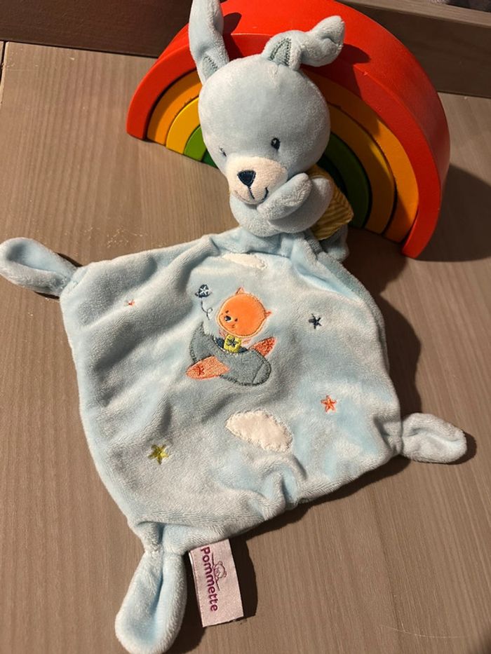 Doudou peluche lapin bleu tee-shirt rayures POMMETTE mouchoir avion nuage étoile Très bon état, tout doux Envoi soigné et rapide