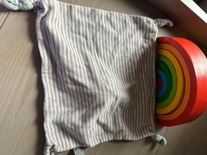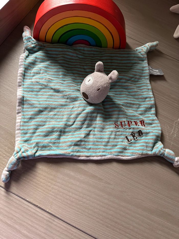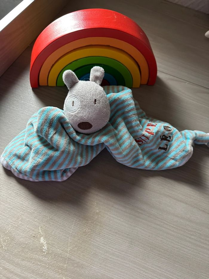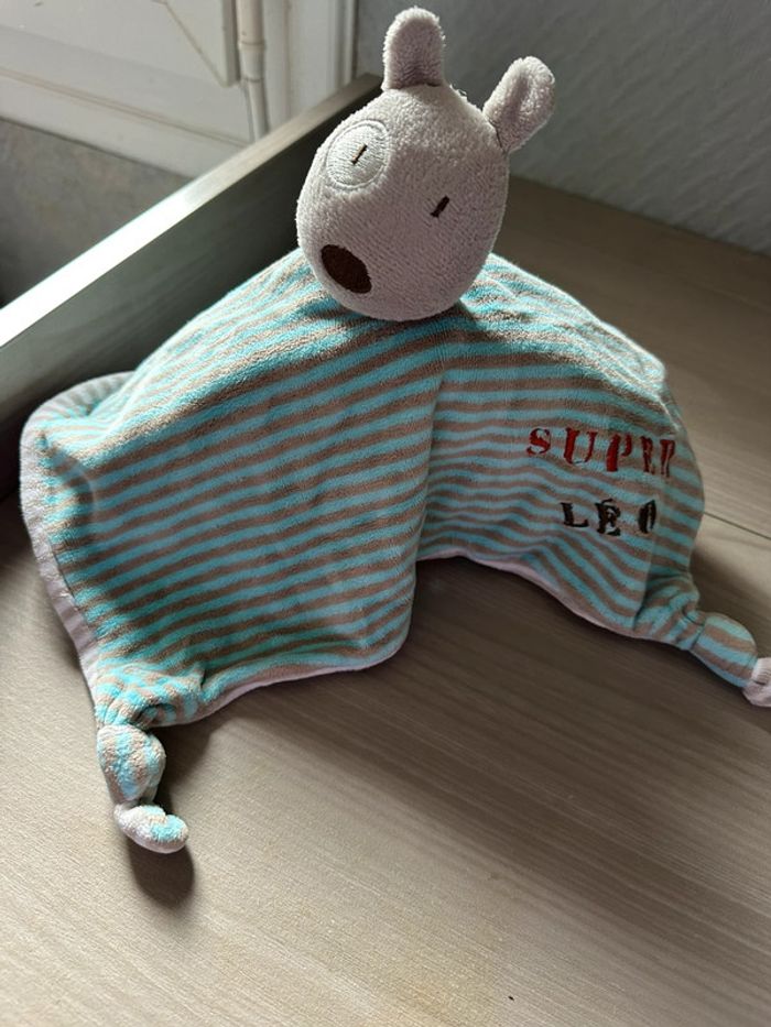Grand doudou chien plat rayé bleu turquoise et gris au recto et gris et blanc au verso. Il est brodé SUPER LEO. 4 noeuds aux coins.🎈