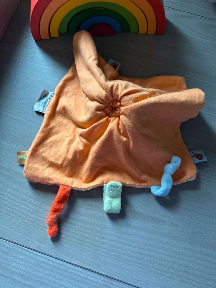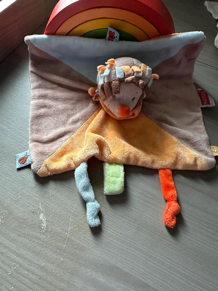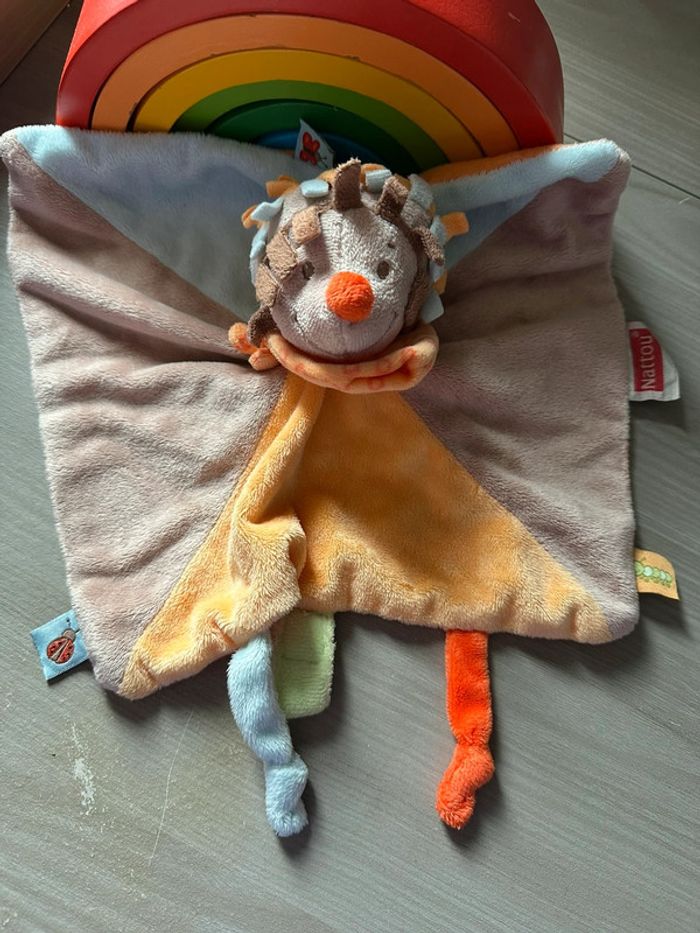 Collection : Little Garden de Nattou Doudou plat hérisson attache tétine, foulard orange autour du cou, 4 étiquettes autour du doudou Coloris : marron, bleu, orange, vert Un trou au dos du doudou pour faire marionnette