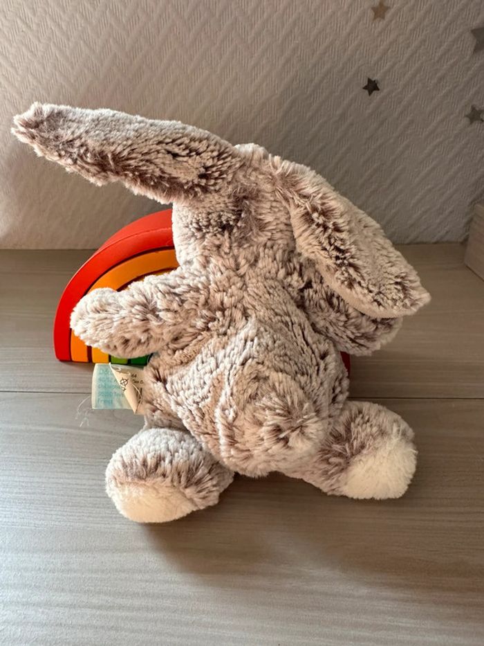 Doudou peluche lapin en velours très doux gris, marron et blanc. Il contient des graines.