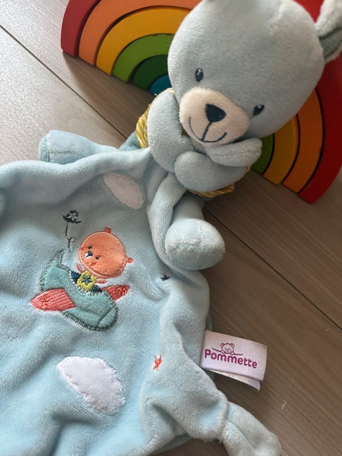Doudou lapin POMMETTE mouchoir bleu Le lapin Pommette tient un mouchoir bleu dans ses mains Mouchoir bleu brodé avec un avion et un ours orange, nuage blanc et petites étoiles Dimension : environ 36 cm avec les oreilles et le mouchoir Coloris : bleu, orange et blanc Lapin mouchoir Pommette marque Intermarché