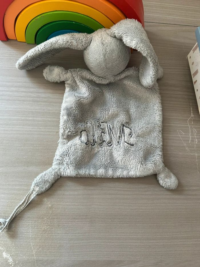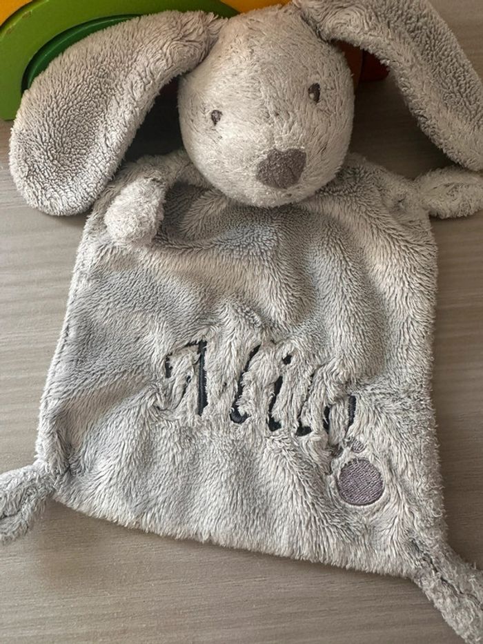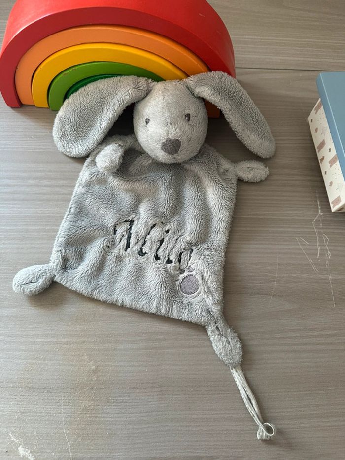 Doudou plat lapin NICOTOY empreinte gris Simba Toys 24 cm personnalisé prénom Mila ( vous pouvez enlevé le prénom)