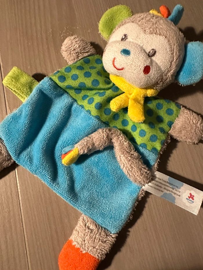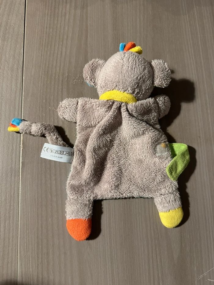 doudou plat gris, ventre bleu et vert à pois bleu, oreilles bleu et verte attache tétine Collection Jungle Dimension : environ 25 cm