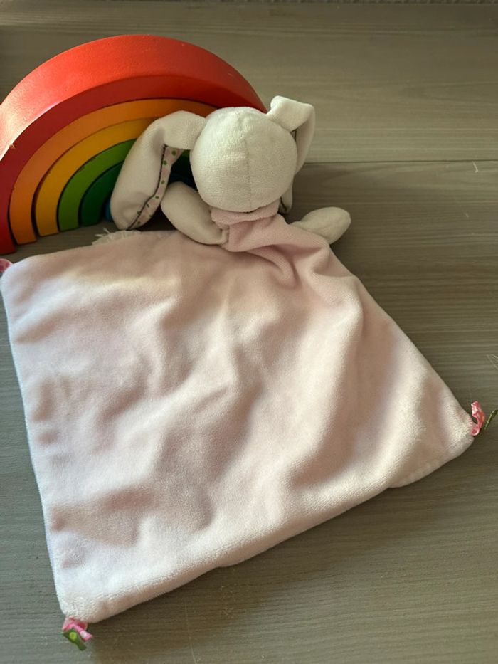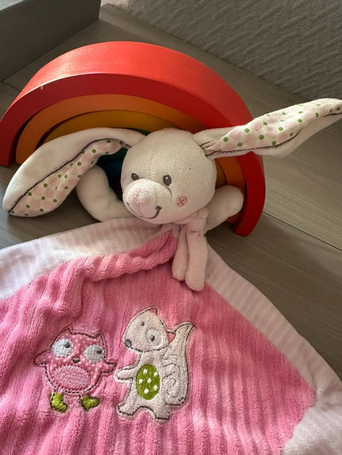 Doudou plat lapin Mots d'enfants rose, ce doudou était vendu dans les magasins Leclerc. Le doudou est en forme de losange, le corps est rose à rayures blanche sur l'extérieur et au centre rose avec une chouette et un renard brodés. Coloris : rose et blanc Dimension : environ 36 cm Motif : chouette et renard brodés L'intérieur des oreilles du lapin est imprimé de ronds et de carrés, son visage est brodé. Étiquette 🏷️ coupé