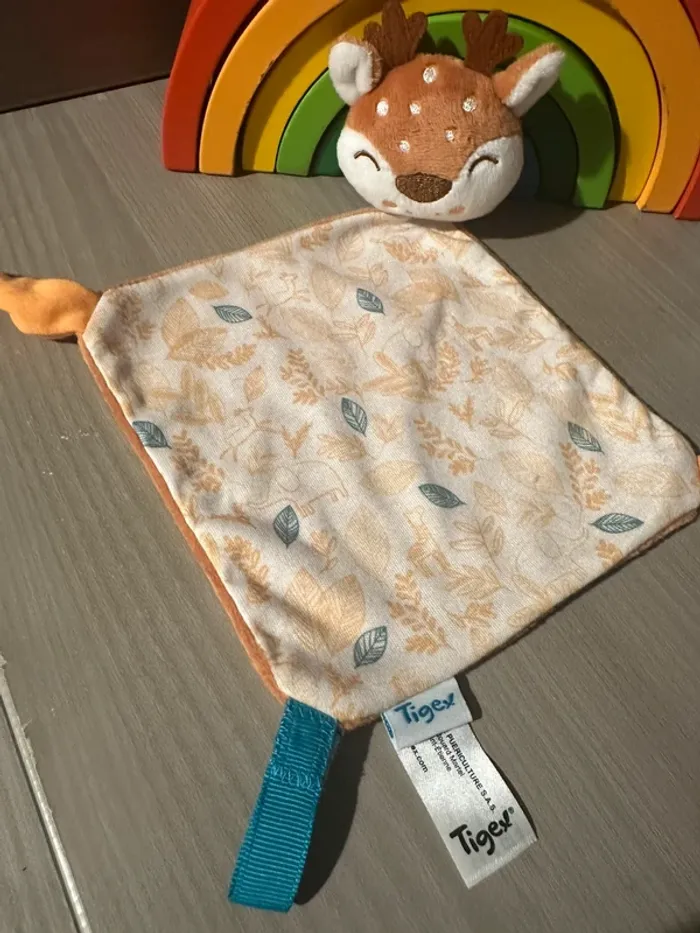 Doudou plat Renne biche tigex velours marron blanc et tissu fantaisie Lien attache tétine à scratch - photo numéro 1