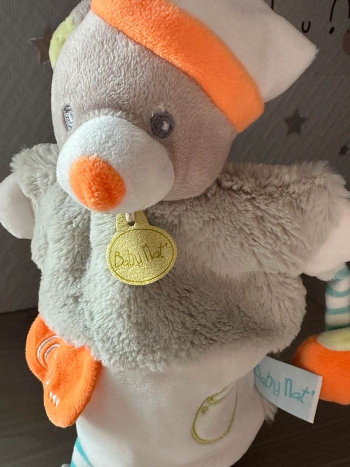 MARIONNETTE OURS ALPHABET EN VELOURS MOUMOUTE GRIS ET VELOURS BLANC SUR LE DOUDOU EST BORDE EN VERT UNE ORANGE ET POCHE A SOULEVER AVEC O...COMME ORANGE TIENT UNE ORANGE A UNE MAIN ETAT PARFAIT !