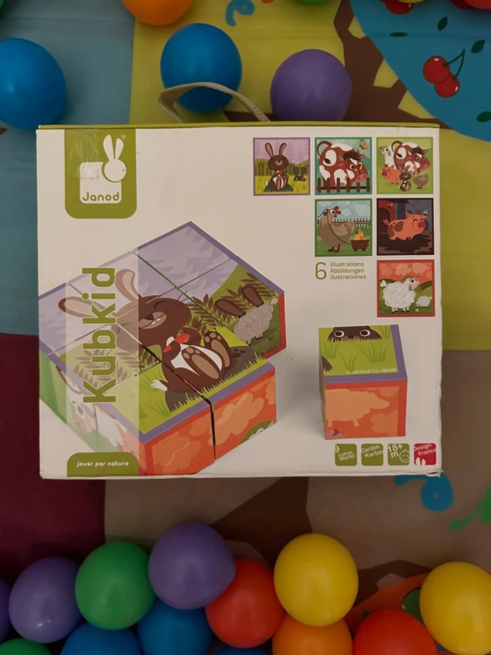 Les cubes bébé kubkid animaux de la ferme de la marque française Janod. Ce jeu d'éveil 2 en 1 est à la fois un jeu de construction, avec des cubes en carton léger et facile à manier, mais aussi un puzzle enfant animaux qui stimule l'imagination des plus petits.