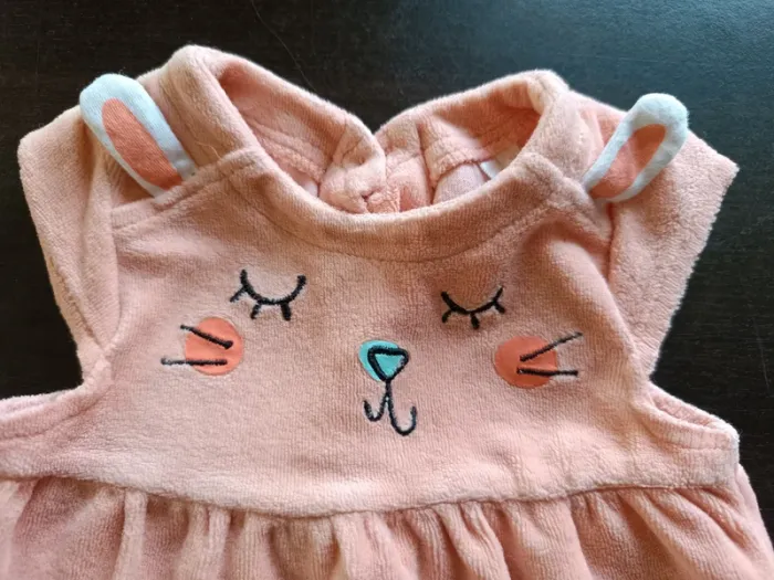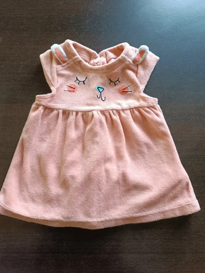 Robe ORCHESTRA Abricot Imprimé sur le devant Fermée par boutons dans le dos 75% Coton & 25% Polyester TAILLE 3 MOIS TRES BON ETAT Allez voir mes autres ventes!
