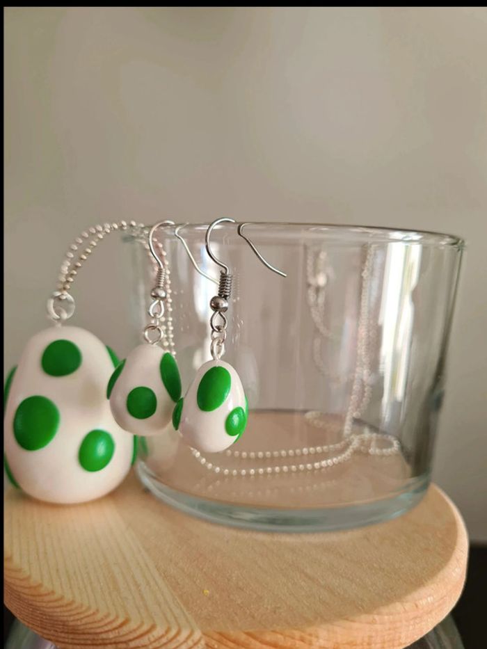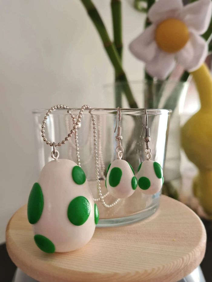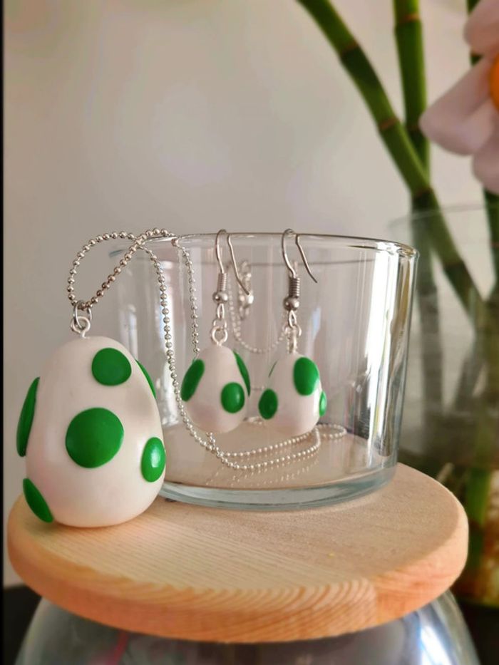 Parure Yoshi collier et boucle d'oreilles oeuf de yoshi #inochitbebijouxetfigurines #yoshi #supermario #geek #mario