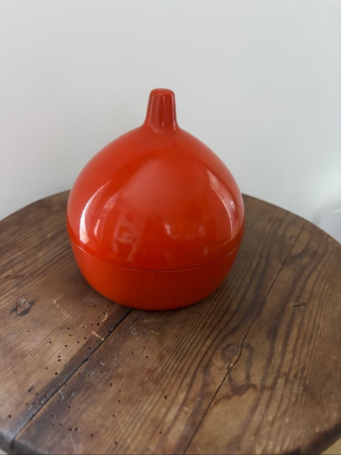 Vintage typique des années 60-70 petite boîte ou pot à sucre En plastique de couleur orange Pièce rare, j’en ai trouvé des similaires de designer scandinaves qui contenaient des dessous de verre Logo sous la boîte que je ne sais identifier En bel état pour l’époque à noter une trace noire d’usure (sur l’endroit où le couvercle repose), visible sur la photo Hauteur 13 cm Diamètre 11 cm