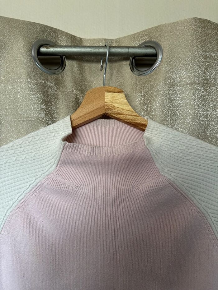 Pull Tommy Hilfiger pour femme, taille L (40/42). Couleur rose pâle avec manches blanches en maille côtelée. Coupe féminine, matière douce et confortable. Idéal pour la mi-saison ou les journées fraîches. Très bon état, porté quelques fois. Envoi rapide et soigné !