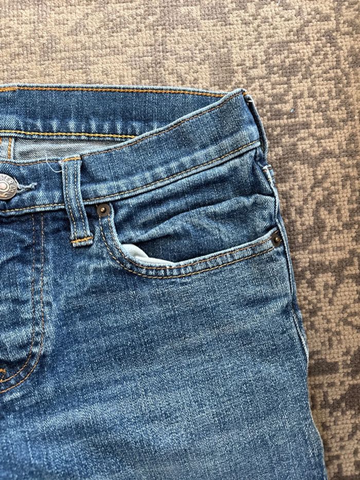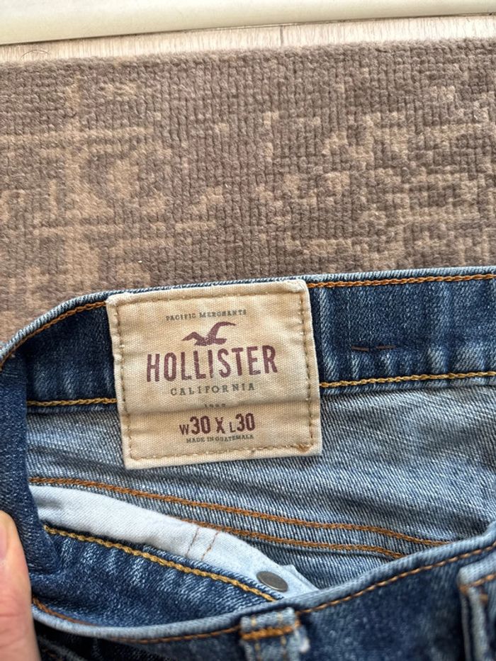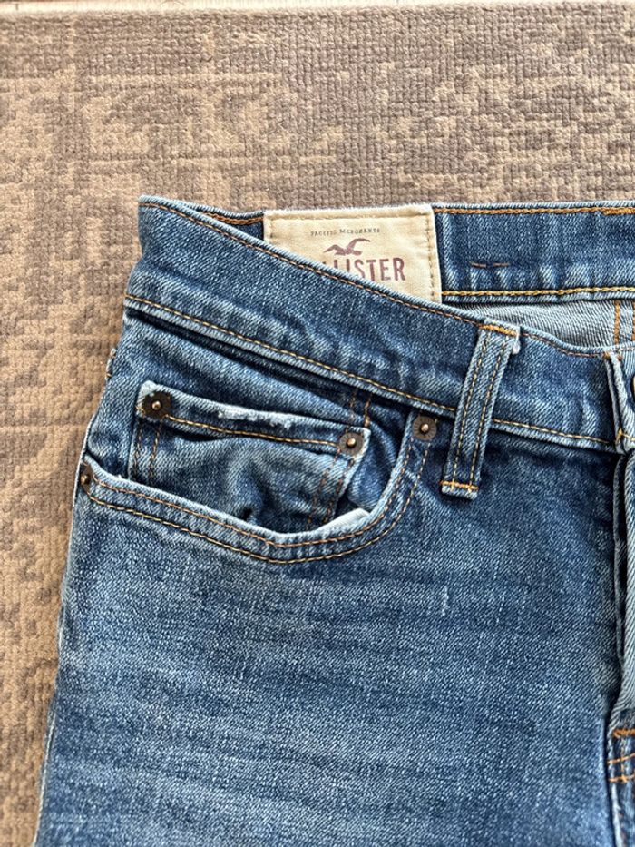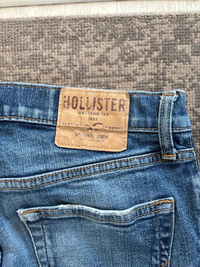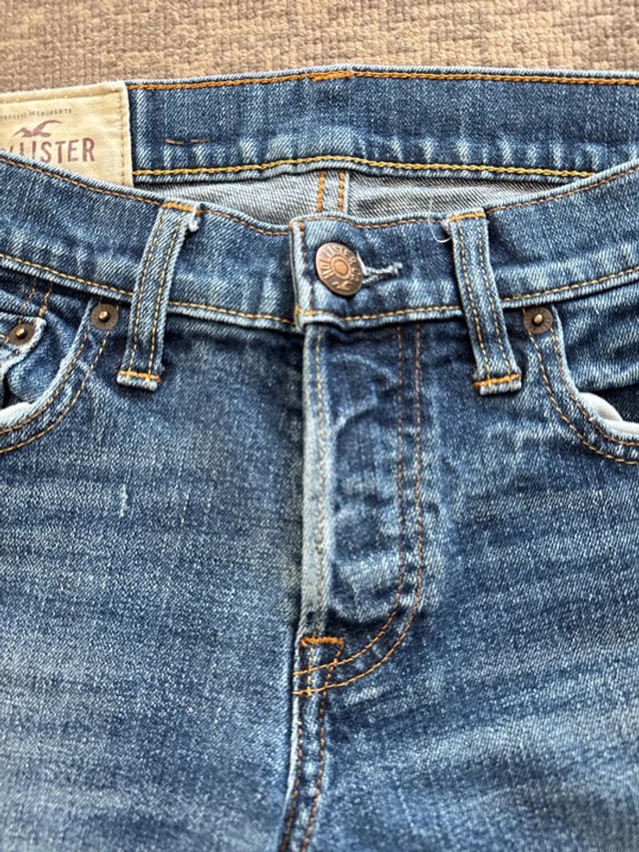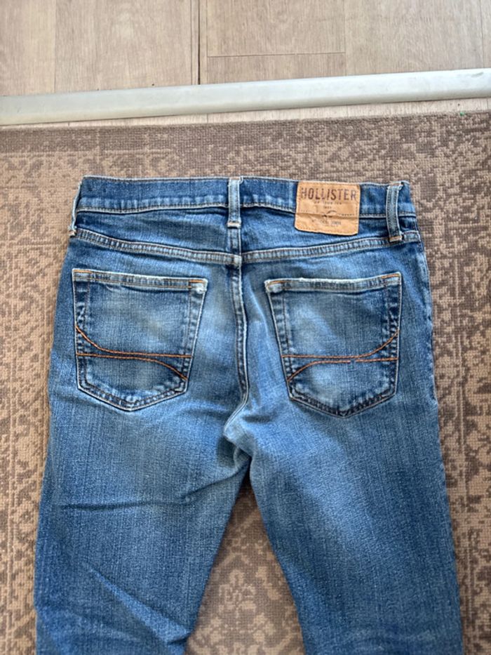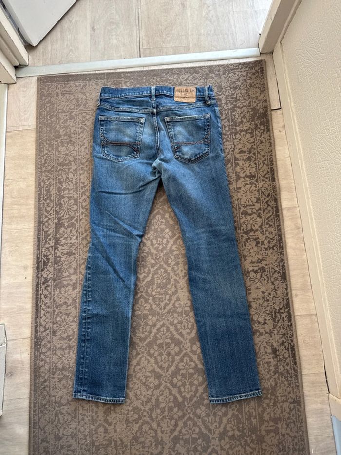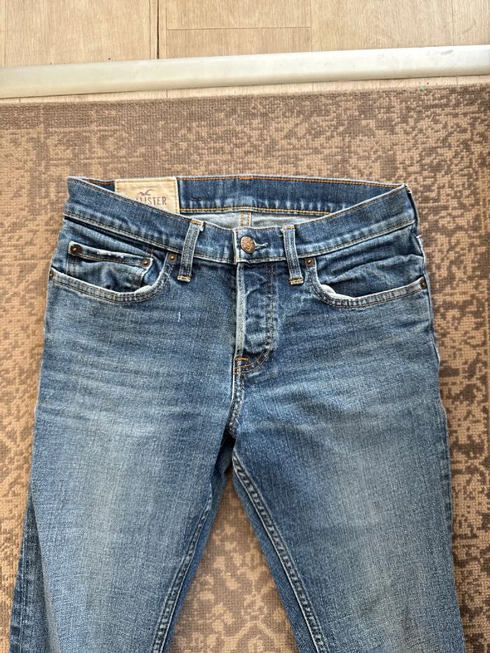 Jean Hollister coupe droite, taille W30 / L30 (équivalent FR 40). Délavage bleu moyen avec un léger effet usé sur les cuisses et les genoux. Style classique et facile à porter au quotidien. Très bon état : peu porté, aucune tâche ni accroc. Coutures solides, bon maintien. Un indispensable du dressing casual !
