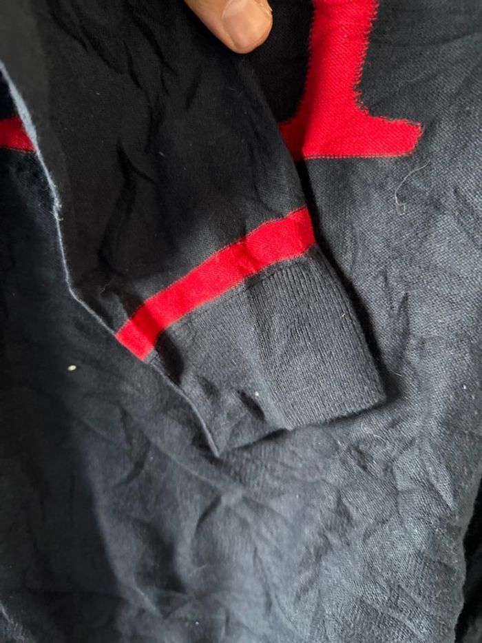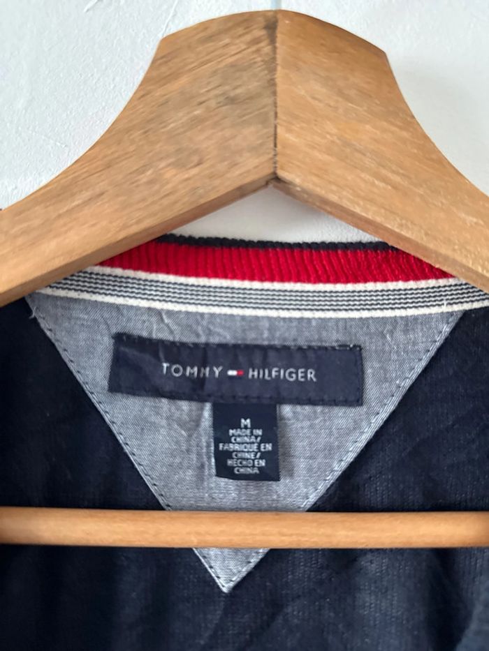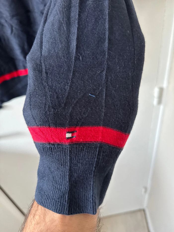 Pull Tommy Hilfiger pour homme, taille M (équivalent FR 40). Modèle en bleu marine avec grand logo H rouge sur la poitrine, bandes rouges aux poignets et à la base. Col rond avec détail en V. Matière agréable, coupe droite, parfait pour un look casual et stylé. Bon état : porté mais bien conservé, pas de trou ni tache visible. Un basique confortable et original signé Tommy !