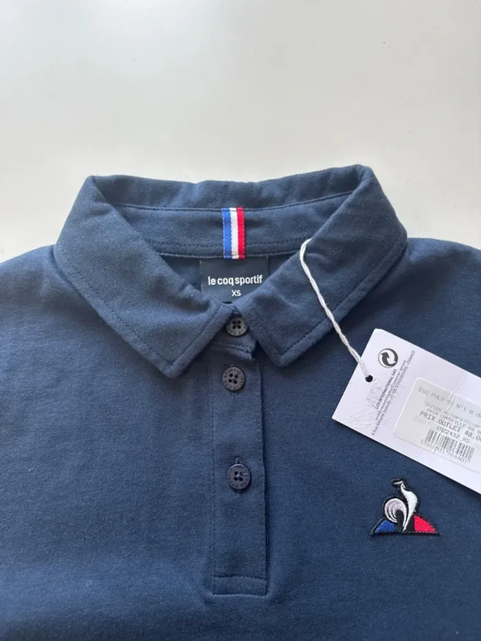 Polo Le Coq Sportif pour femme, coupe cintrée, couleur bleu marine, taille XS. Logo emblématique brodé sur la poitrine avec les couleurs bleu/blanc/rouge. Matière confortable et respirante, parfait pour un look sport-chic au quotidien. Article neuf avec étiquettes – jamais porté. Prix d’origine : 69€ (prix outlet : 48€). Taille : XS (femme) État : Neuf avec étiquettes Marque : Le Coq Sportif Couleur : Bleu marine Hashtags : #lecoqsportif #polofemme #modefemme #sportchic #polobleumarine #lookcasual #vetementneuf #madeinfrance #stylefrancais