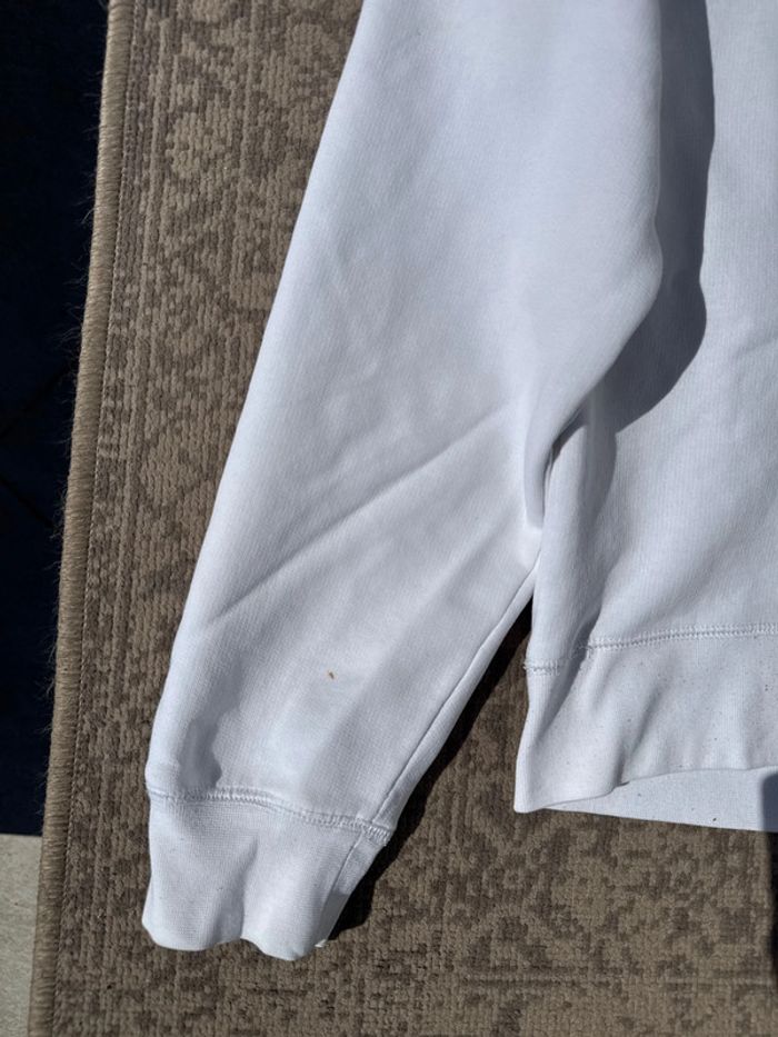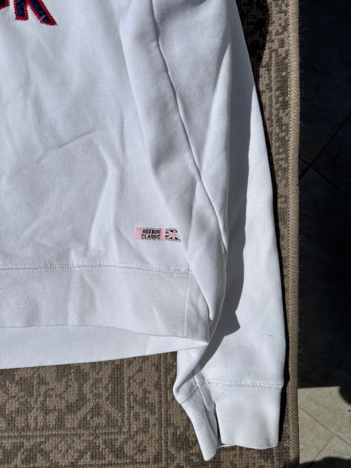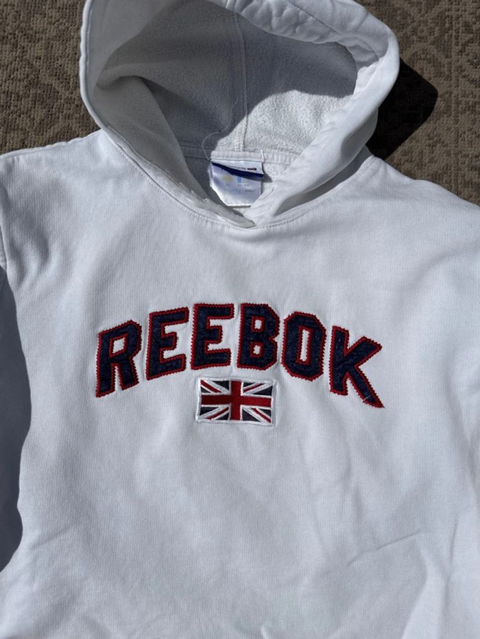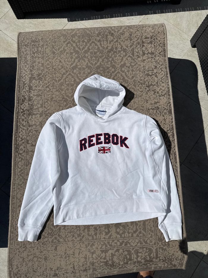 Sweat à capuche Reebok Classic blanc avec logo brodé et drapeau britannique sur la poitrine. Coupe légèrement cintrée, convient pour femme. Doublure en molleton pour plus de confort. Taille : non précisée, équivaut à un S femme. État : bon état général, quelques micro bouloches visibles sur le bas (voir photo), Cordon de capuche manquant. Genre : Femme Taille : S/M État : Bon état