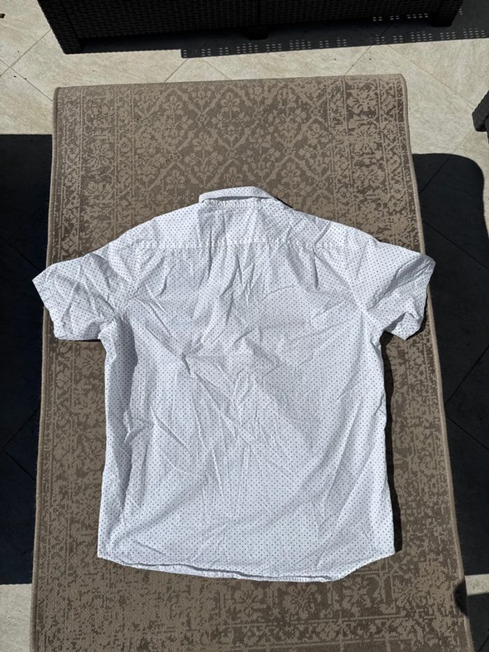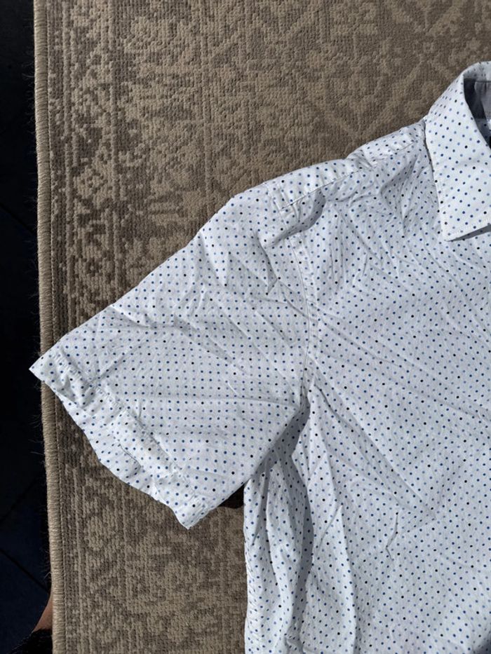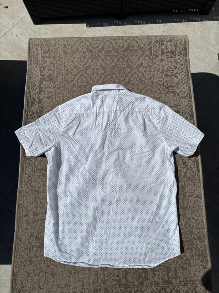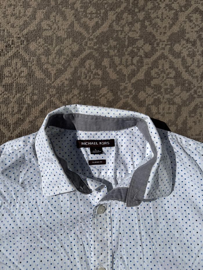 Chemise à manches courtes Michael Kors pour homme, coupe classique (Classic Fit). Motif à pois bleu marine sur fond blanc, avec intérieur de col contrasté en gris. Taille L. Tissu léger, parfait pour la saison printemps/été. État : Très bon état général, aucune tache ni accroc. 100 % coton – confortable et agréable à porter. Genre : Homme Taille : L État : Très bon
