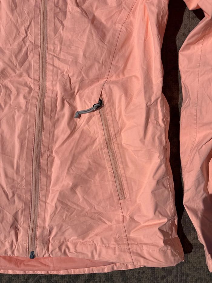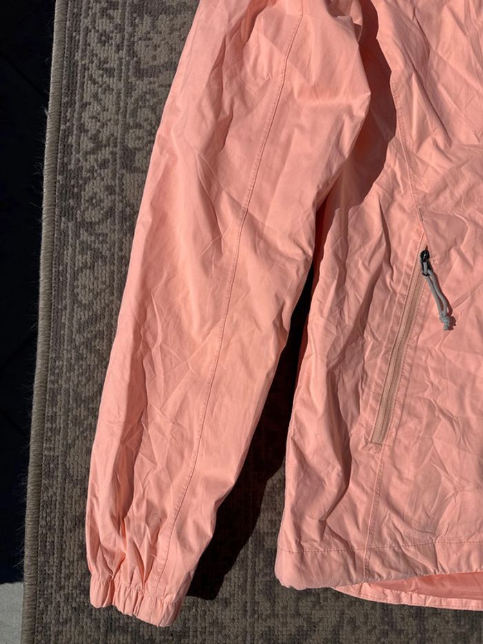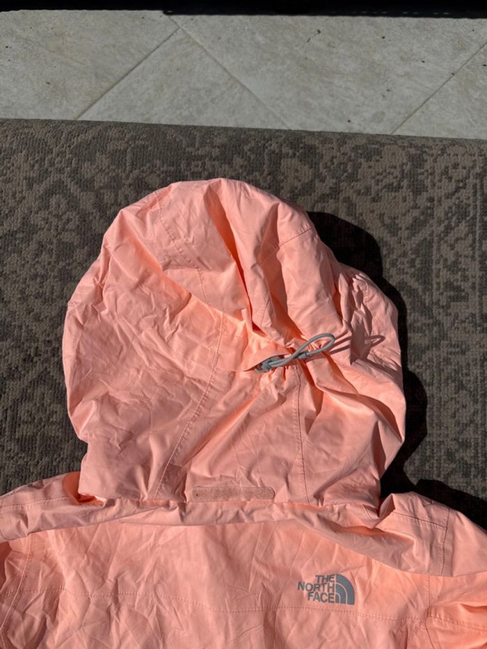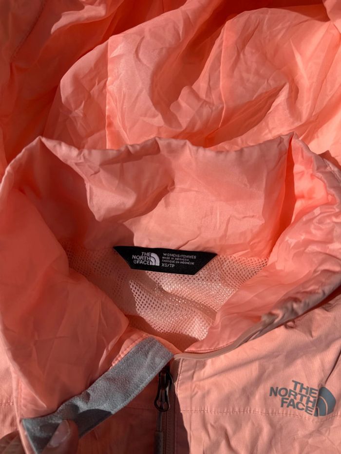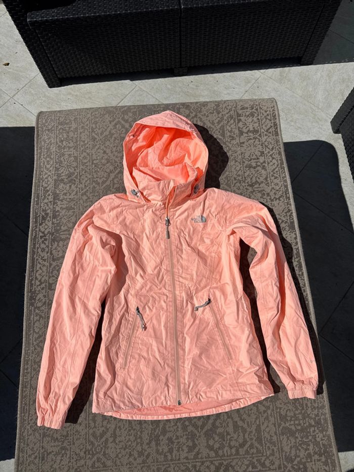 Veste légère coupe-vent The North Face pour femme. Coloris rose saumon très tendance, taille XS. Modèle avec capuche, fermeture zippée, poches latérales zippées et cordons de serrage au niveau de la capuche. Logo The North Face brodé à l’avant. Parfait pour le printemps ou les randonnées légères. État : Bon état général, peu portée. Taille : XS Genre : Femme Défauts : Aucun défaut notable À repasser