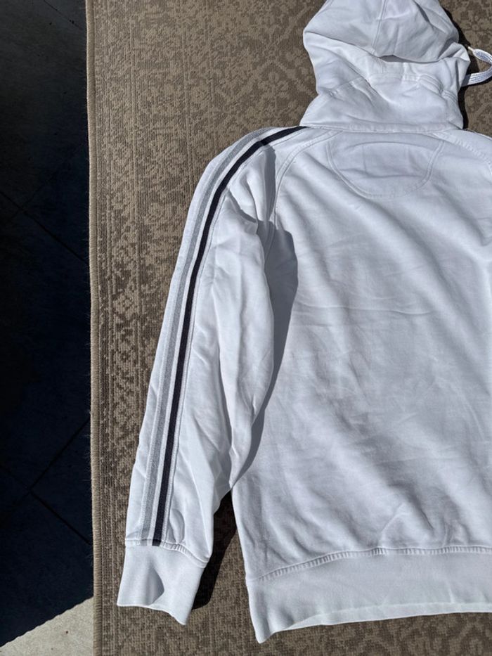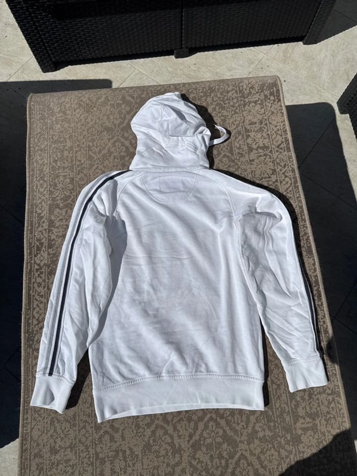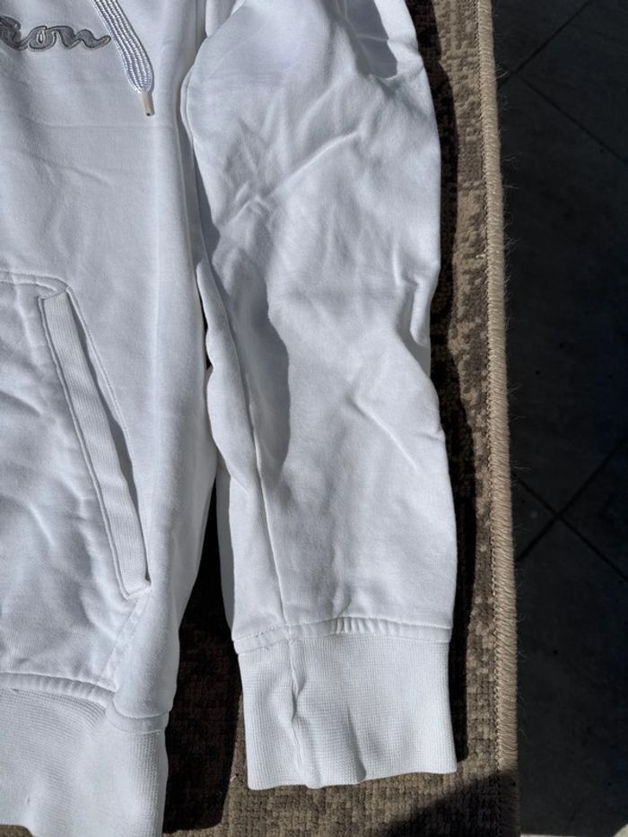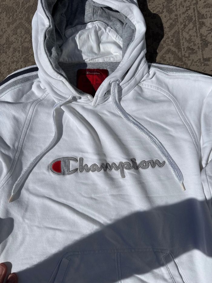 Sweat à capuche blanc de la marque Champion, avec logo brodé sur la poitrine. Capuche doublée grise avec cordon, poche kangourou à l’avant. Taille non indiquée mais correspond à un S ou M. Bon état général, très léger signe d’usage normal, aucun défaut majeur. Modèle rare, coupe confortable. Genre : Homme (peut convenir aussi à une femme pour un style oversize)