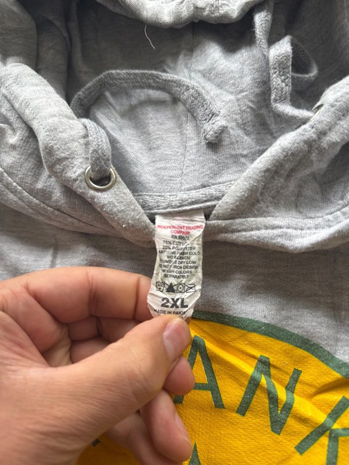 Sweat à capuche gris clair avec logo rond jaune et vert “PDANK RECORDS” à l’avant. Taille 2XL, coupe unisexe. Marque du sweat : Independent Trading Company, connu pour ses vêtements confortables et résistants. Capuche avec cordon de serrage, poche kangourou pratique à l’avant. À noter : article à repasser. État : Très bon état Taille : 2XL Genre : Unisexe Marque : Independent Trading Company Défauts : Aucun défaut visible, juste froissé (à repasser)