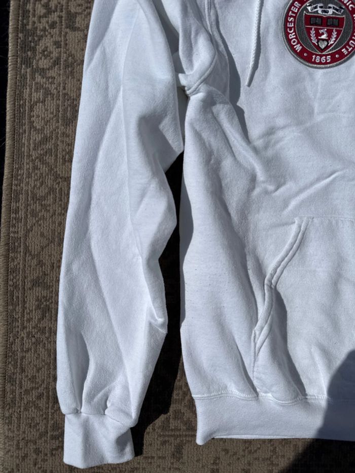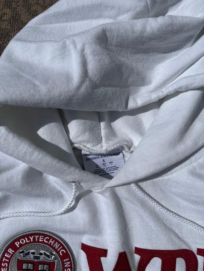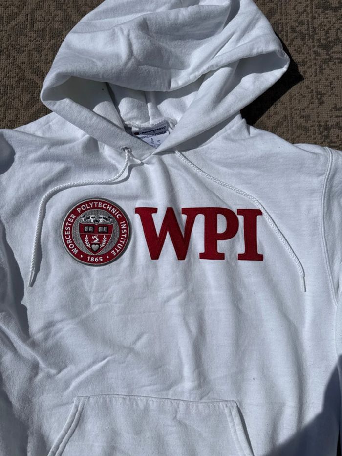 Sweat à capuche blanc de la marque Champion, en collaboration avec le Worcester Polytechnic Institute (WPI). Logo WPI brodé en rouge sur la poitrine, logo Champion sur la manche. Coupe classique avec poche kangourou. Taille : S Genre : Homme État : Bon état général – quelques légères bouloches sur le côté gauche (voir photo), mais aucun trou ni tache. Matière : 50% coton, 50% polyester Détails : Capuche sans cordon, intérieur doux et chaud.