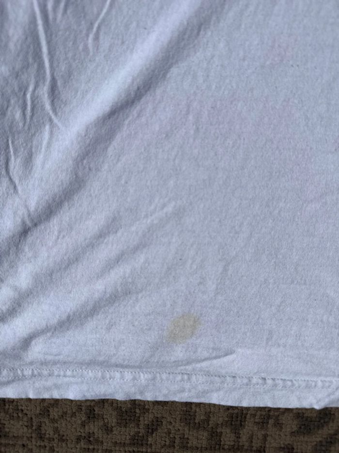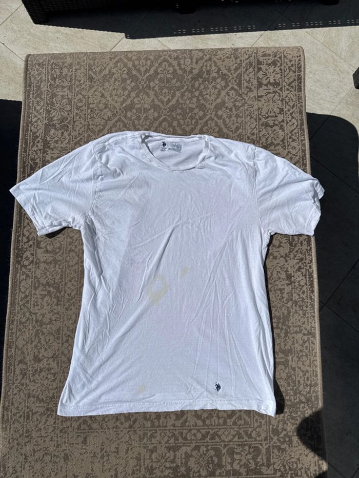 T-shirt blanc de la marque U.S. Polo Assn, coupe classique, logo discret brodé sur le bas. Taille : XL (convient pour un 1m75 à 1m85 environ) Genre : Homme État : Bon état général, quelques taches visibles sur le devant (voir photos), mais encore parfaitement portable. 100 % coton, très agréable à porter. Défauts : Plusieurs taches visibles sur le devant (prix ajusté en conséquence).
