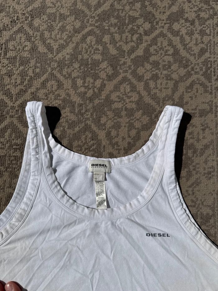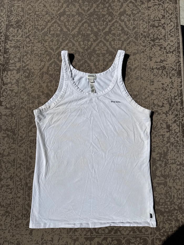 Débardeur blanc de la marque Diesel Underwear, simple et confortable, idéal à porter en dessous d’un t-shirt ou seul en été. Taille L Coupe ajustée et matière stretch pour plus de confort. 100 % coton (avec une petite part d’élasthanne pour l’élasticité).