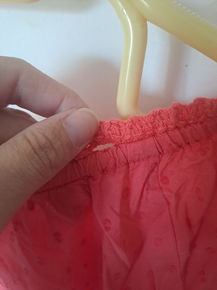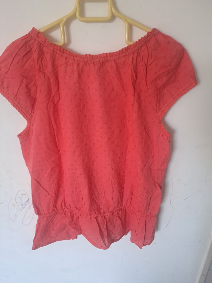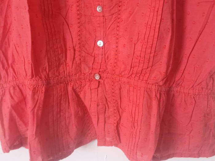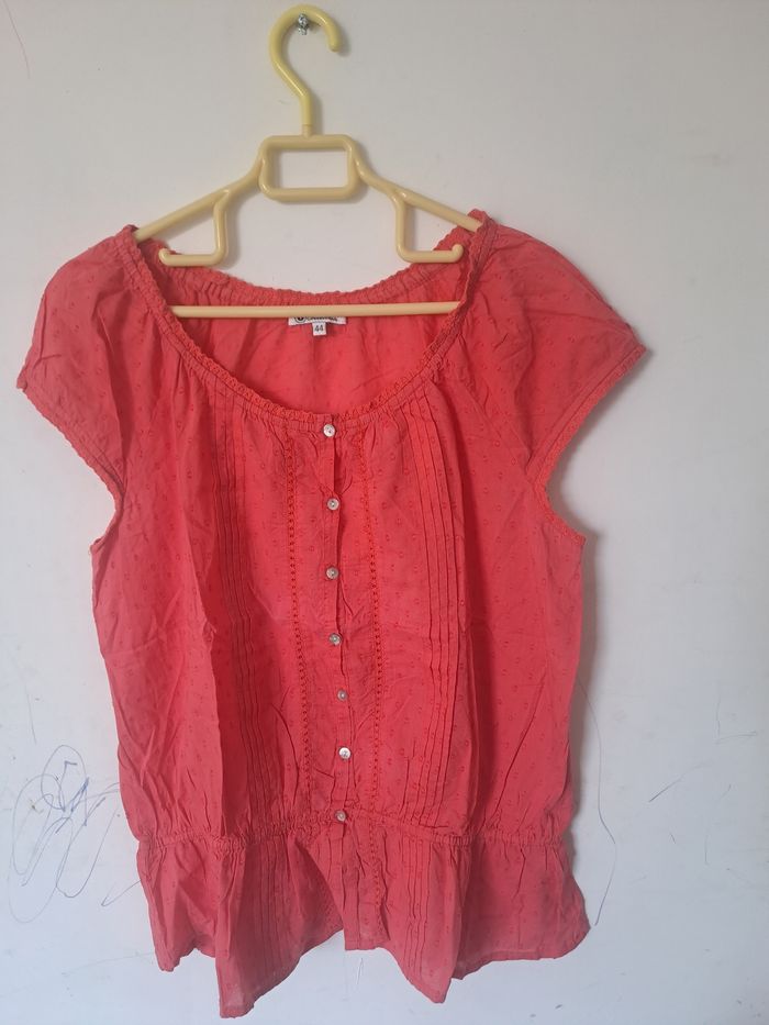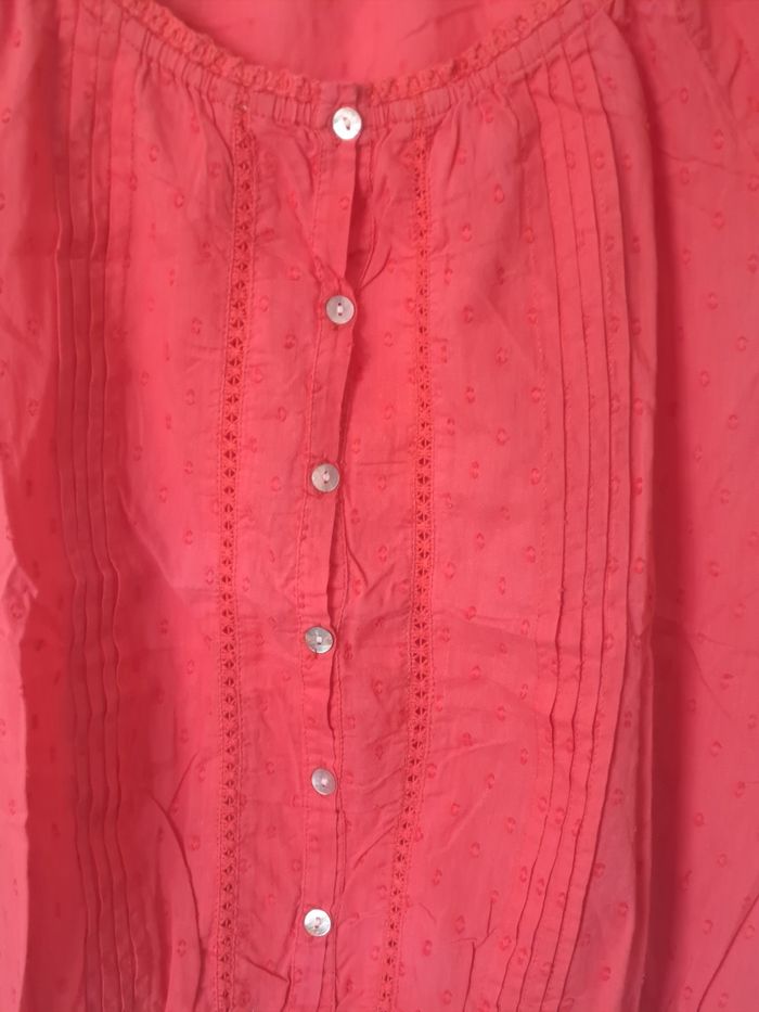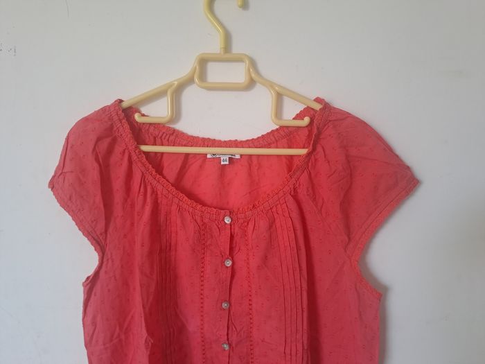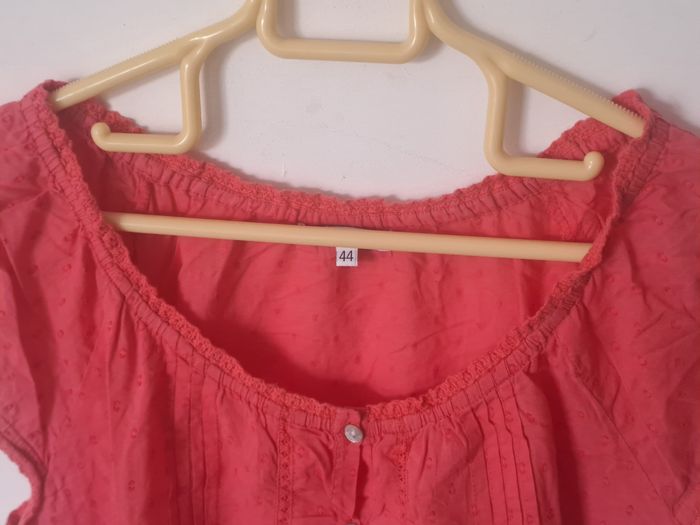 Blouse manches courtes Avec boutons sur le devant Ajouré par endroit ⚠️ un petit trou (decousu) au col à l'arrière (voir photo) Couleur rose / corail Taille 44 Marque U Collection