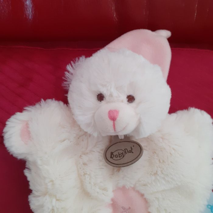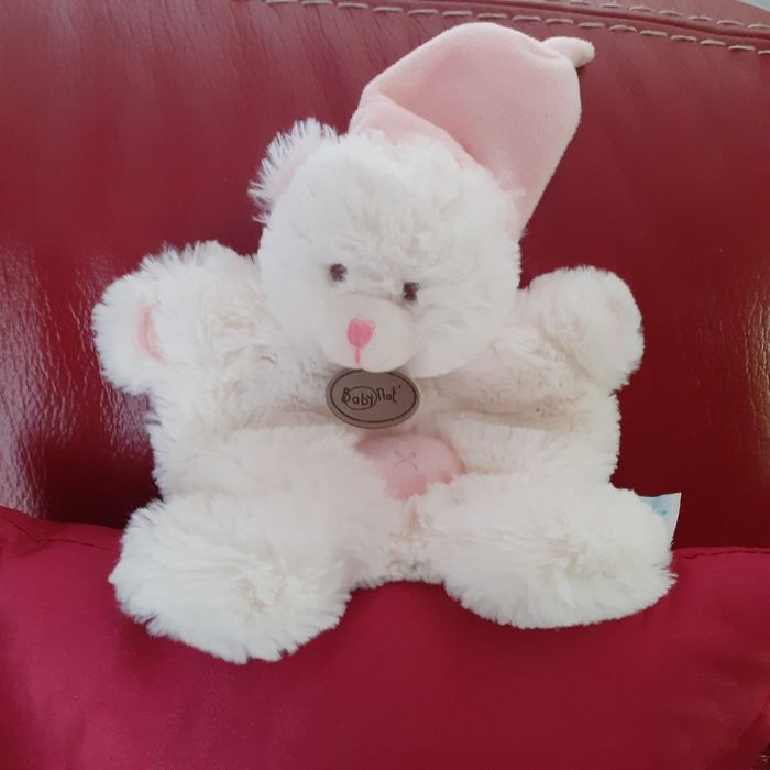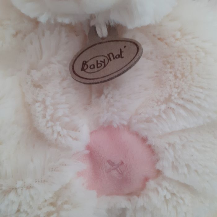 Doudou marque Baby Nat; tissu moelleux; tête et pattes arrières rembourrées; yeux et bouche brodés. Hauteur totale de cm. Lavable à 30° // voir photos pour détails