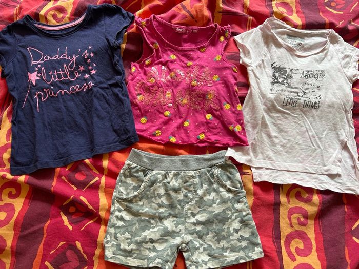 Lot de 4 pieces 24 mois : - 1 short tex 23 mois style militaire - 1 tee shirt baby girl 24 mois 36 mois bleu - 1 tee shirt in extenso 2 ans rose - 1 débardeur ananas punkids 26 mois Idéal pour aller à la Creche On voit qu’ils ont été portés mais ni tache ni trou #evok83fille24mois N’hésitez pas à regarder mon dressing, je vends des articles pour toute la famille ! Abonnez vous à mon compte, je mets souvent des nouveautés !