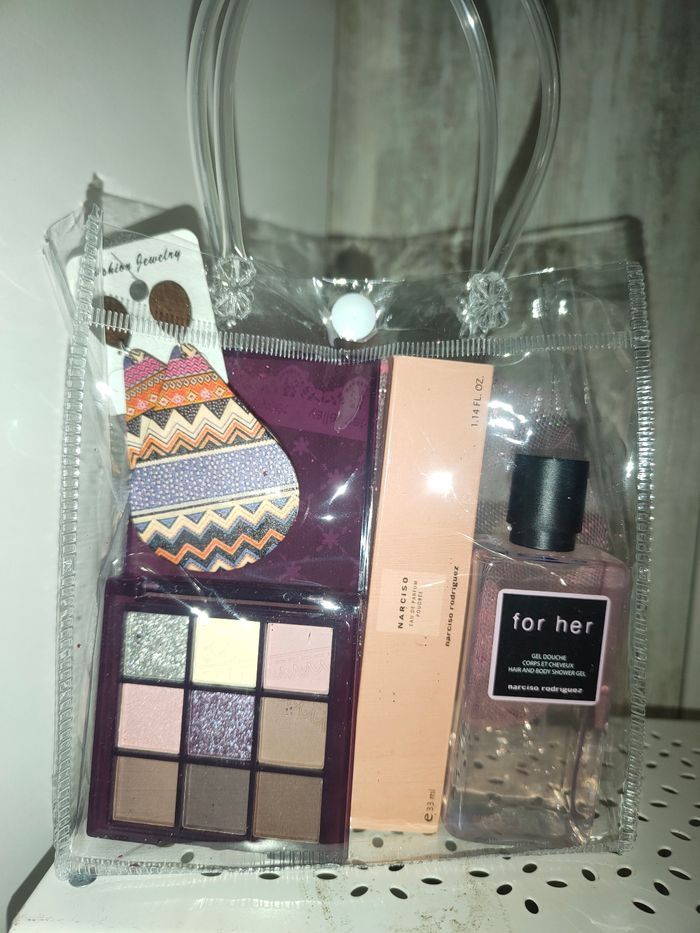 Coffret femme neuf comprenant 1 parfum 1 gel douche 1 paire de boucles d'oreilles fantaisie 1 palette de maquillage