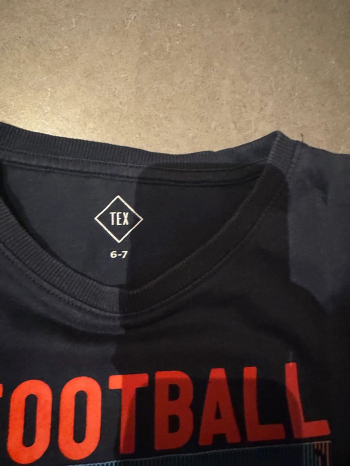 T shirt manches courtes Marque: Tex Modèle: Football connection / But / Ballon Couleurs: Bleu marine, orange, vert, blanc & noir Taille: 6/7 ans Très bon état (voir les photos) D'autres articles de marques pour garçon dans mon inventaire