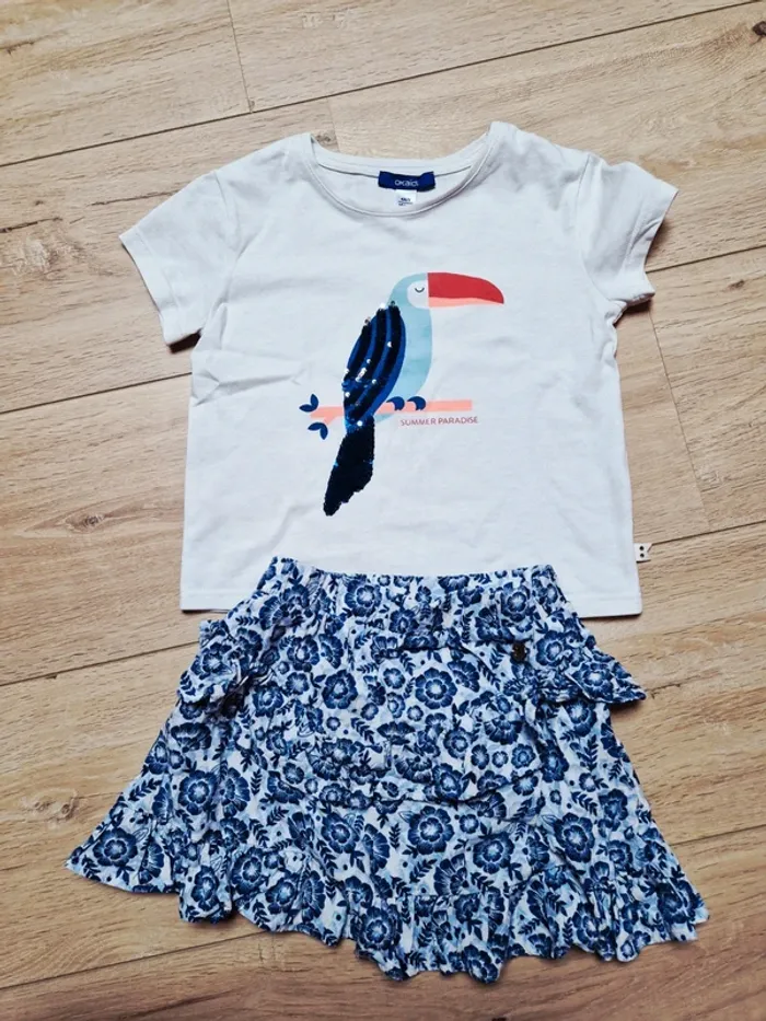 Ensemble toucan composé : - d'une jupe fluide Lulu Castagnette 4 ans, parfait état - dun T-shirt MC toucan Okaïdi, sequins impeccable. Petite tâche sur le bas qui ne se voit pas porté (voir photo) 📷 Ma fille a 4 ans sur la photo 📷 Mon dressing est rangé par taille. Pour voir tous mes vêtements et accessoires de 4 ans, cliquez sur le lien #celine_yiyi_4a ATTENTION pour que les liens fonctionnent, pensez à supprimer vos filtres et recherches 😊