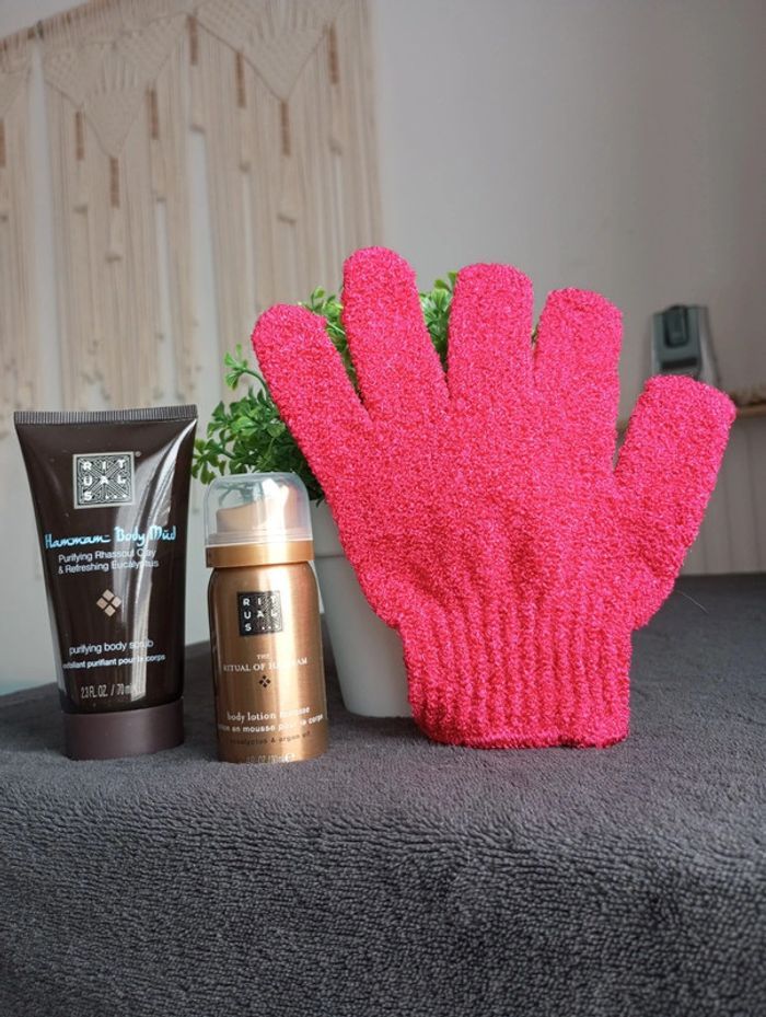 Petit ensemble Hammam de rituals : -hammam body mud Exfoliant purifiant corps 70ml Rhassoul eucalyptus -petit gant Rituals exfoliant en polyamide -ritual of hammam Lotion en mousse corps 30ml Eucalyptus et huile d'argan