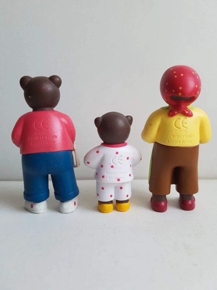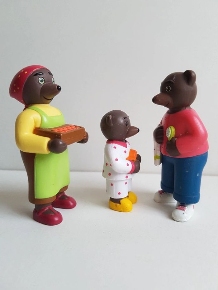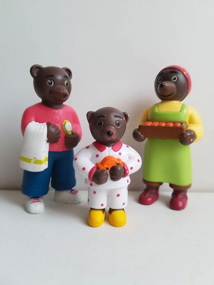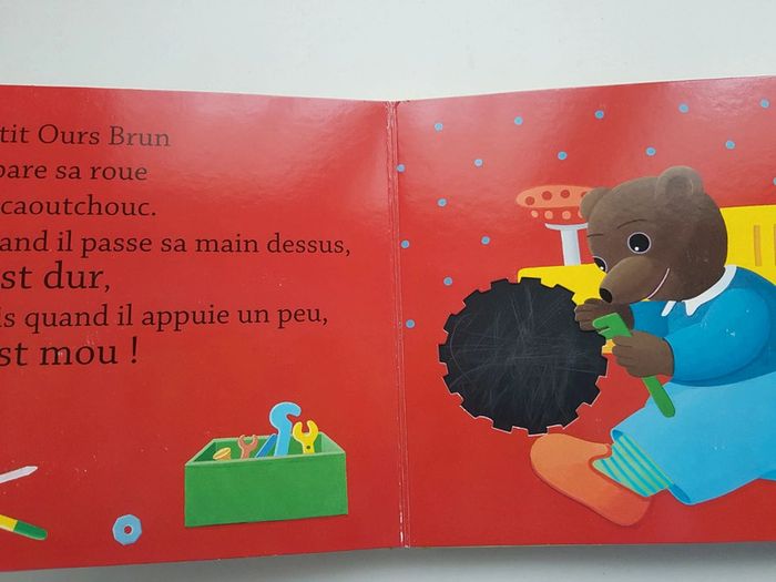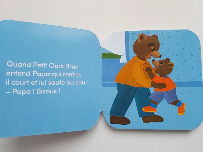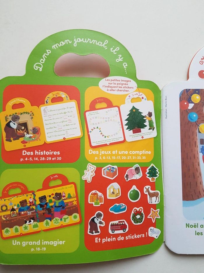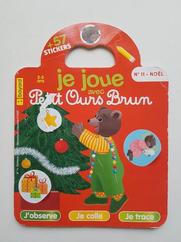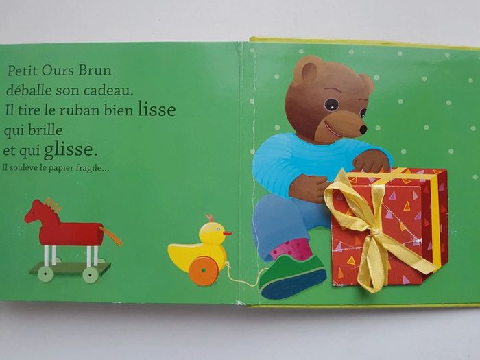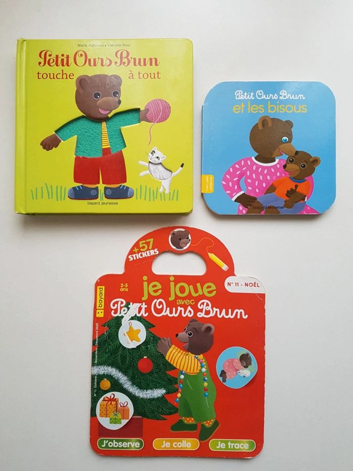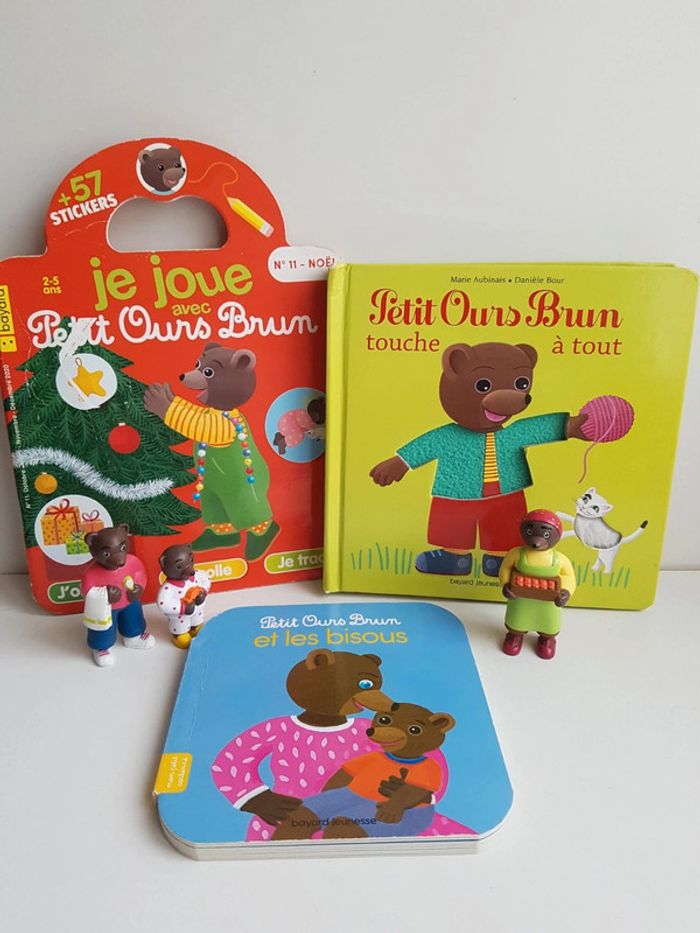 Lot Petit ours brun comprenant 3 livres et 3 figurines : • 3 figurines Petit ours brun des éditions Bayard Presse d'après les illustrations de Danièle Bour - papa ours avec serviette et brosse à dents - maman ourse et un plat à gâteaux Hauteur : 7,5 cm - petit ours en pyjama et jouet voiture, un peu usée • Petit Ours Brun et les bisous, Marie Aubinais - Danièle Bour Bayard Jeunesse, collection mon petit cartonné Dimensions : 14,5 × 14,5 cm Petit Ours Brun aime les bisous : les petits, les gros, les tout doux... Mais quand il est en train de jouer, il ne veut pas qu'on lui fasse de baisers ! • Petit ours brun touche à tout Un album aux solides pages cartonnées invitant à découvrir diverses textures pour développer le sens du toucher, en compagnie de Petit Ours brun, qui cueille des oranges, s'essuie les pieds sur le paillasson, répare sa roue en caoutchouc, caresse son coussin de velours, etc. Le cadeau avec ruban est abîmé Dimensions : 18,5 × 18,5 cm • magazines Je joue avec petit ours brun, numéro 11 Noël Couverture abîmée Un album avec histoire, jeux et autocollants
