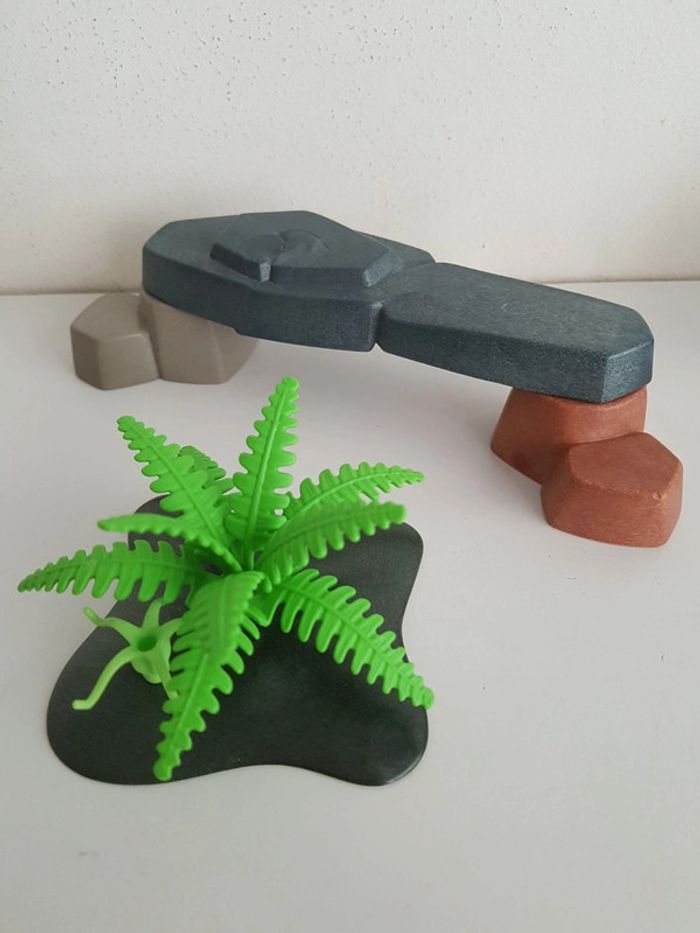 Lot de Playmobil sur le thème de la Préhistoire 1 figurine : homme des cavernes avec barbe 2 animaux : tigre à dents de sabre et bébé mammouth Accessoires : grand rocher, plante, torche avec flamme et couteau silex