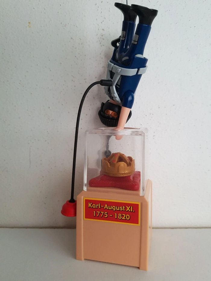 Lot de Playmobil sur le thème des policiers et des voleurs Set amusant du cambrioleur de musée avec une alarme sonore sur la vitrine de la couronne du roi. L'alarme se déclenche lorsque la vitre est soulevée (fonctionne avec pile fournie). 2 figurines : voleur masqué et garde de la police Accessoires : couronne, corde avec crochet, ventouse, talkie-walkie, lampe torche, outil de cambrioleur