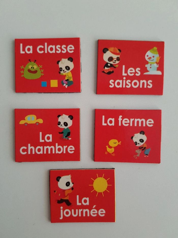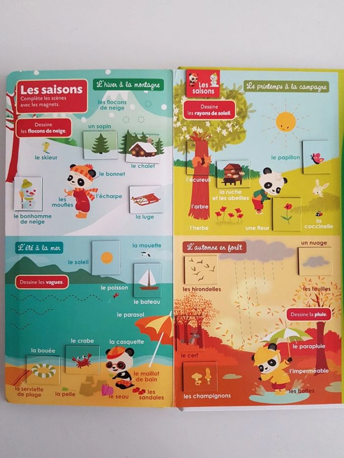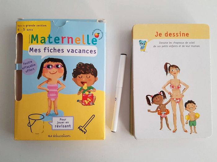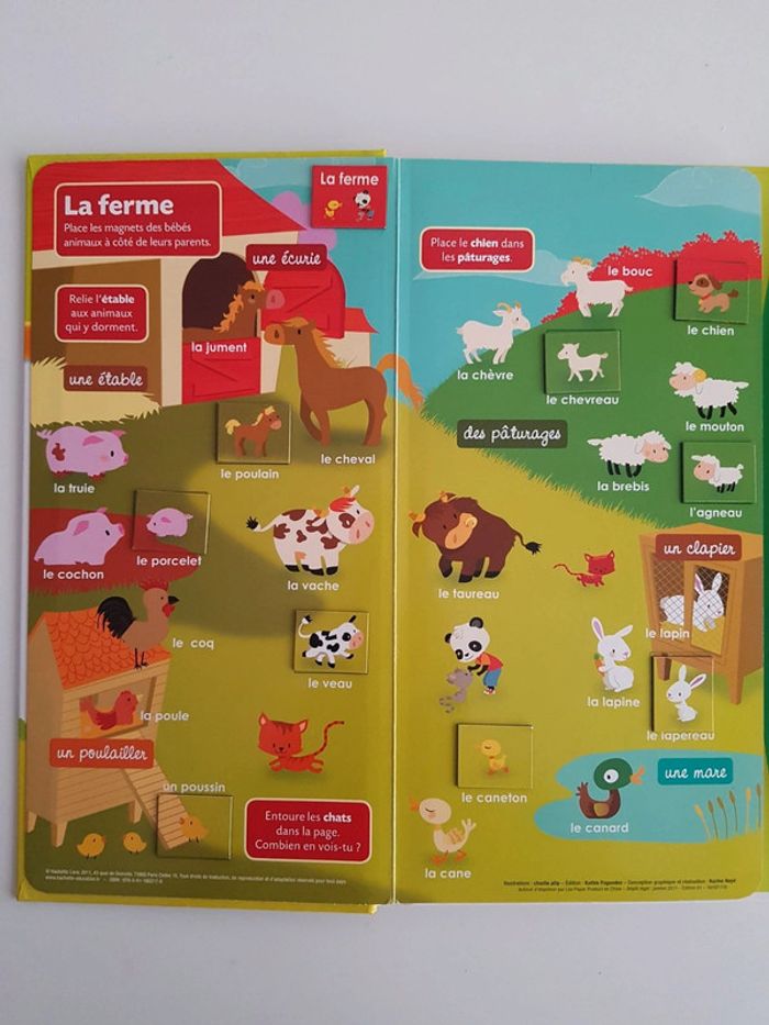 Lot de 2 jeux éducatifs magnétique ou effaçable et 1 feutre • Mes fiches vacances Découvertes Maternelle : Vers la grande section, 4-5 ans, Gallimard jeunesse Une boîte de seize fiches effaçables recto verso : une face pour observer, une face pour écrire. Pour faire et refaire les exercices et effacer grace au feutre effaçable Boîte usée COMPLET : 16 fiches et 1 feutre Dimensions des cartes : 13 × 19 cm • Mon imagier aimanté Je découvre et j'apprends, Hachette Manque le feutre Destiné aux enfants à partir de 3 ans. Un livre-jeux magnétique sur les premiers apprentissages de la maternelle pour enrichir le vocabulaire et susciter l'éveil. 54 magnets en couleurs à placer dans le livre aimanté pour compléter les scènes illustrées selon les indications pédagogiques. 5 thèmes abordés : - la ferme: pour apprendre le nom des animaux, de leurs petits et de leur maison - la chambre: pour acquérir les notions de positionnement dans l'espace - la classe: pour reconnaître et classer les formes et les couleurs - la journée: pour parler des activités quotidiennes et comprendre les notions de temps - les saisons: pour observer les changements liés aux saisons Dimensions : 23 × 28,5 cm