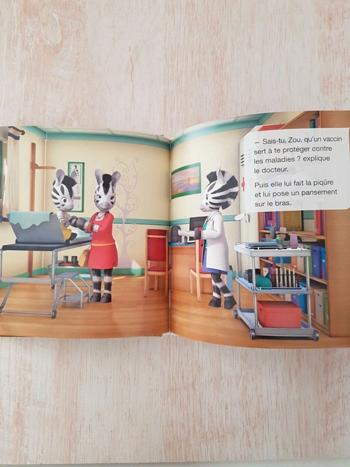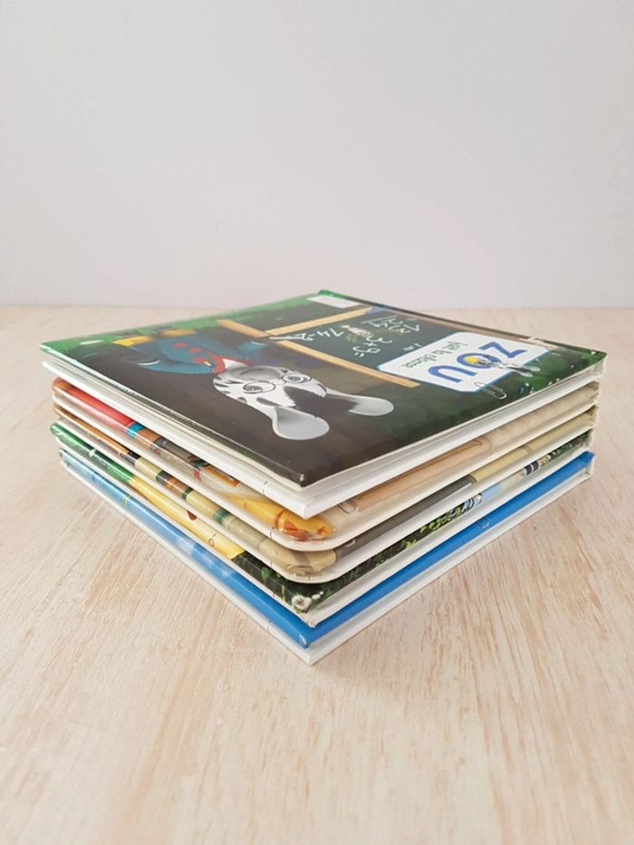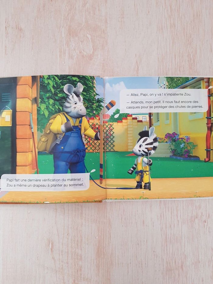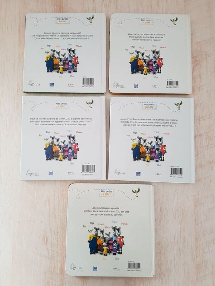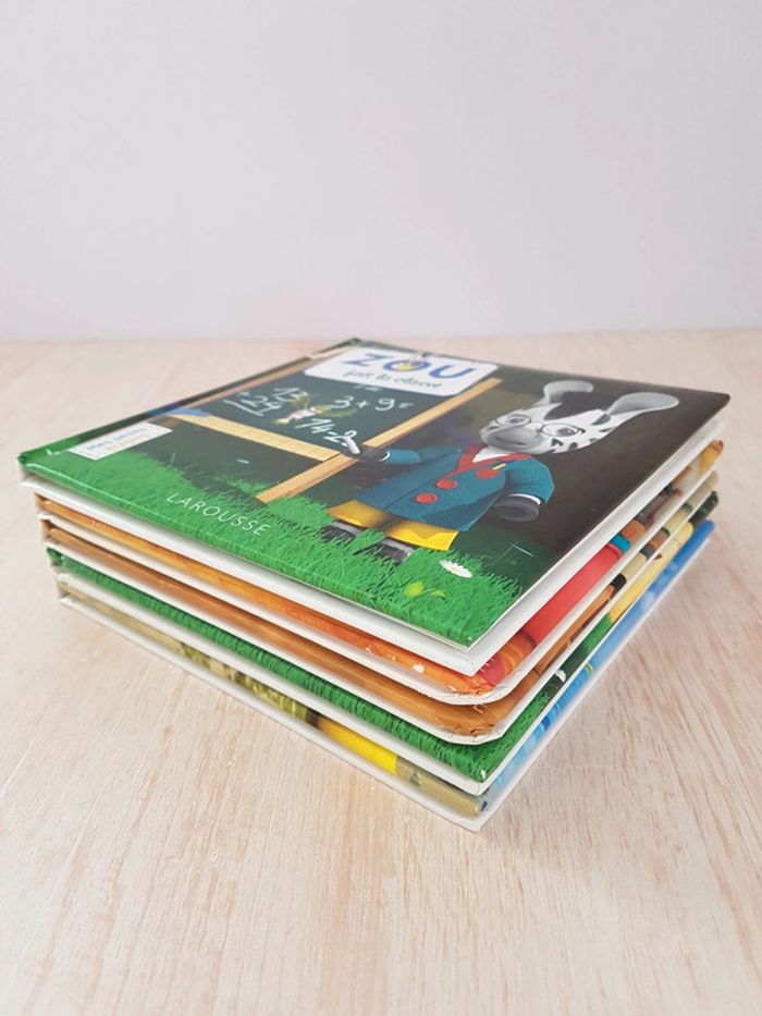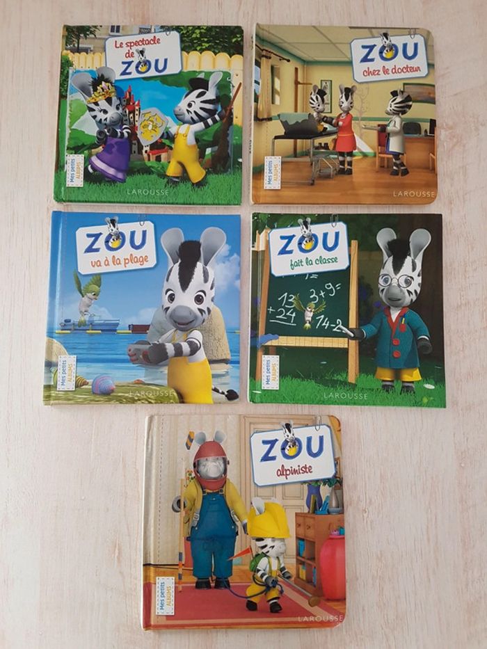Lot de 5 livres de la collection Zou Mes petits albums. Des illustrations colorées, des histoires simples et amusantes tirées du dessin-animé pour une approche facile de la lecture. Éditions Larousse jeunesse Livres encore en bon état, coins usés. Dimensions : 17 × 17 cm • Le spectacle de Zou Le carnaval est annulé et le petit zèbre décide d'organiser un spectacle avec une pièce de théâtre. • Zou alpiniste, pages plastifiées Le garçon part faire de l'escalade dans la maison avec son papi. • Zou fait la classe,  pages plastifiées Le garçon joue au maître d'école avec ses amis. • Zou va à la plage, pages plastifiées Le zèbre passe la journée en bord de mer avec son appareil photo. • Zou chez le docteur Visite médicale pour le garçon.