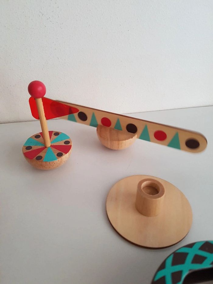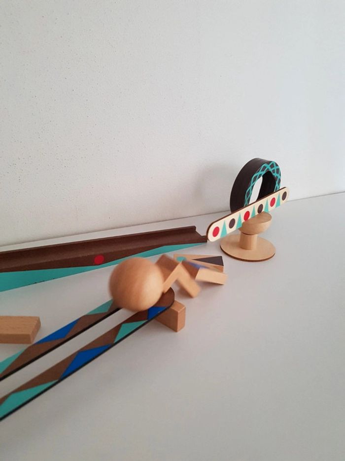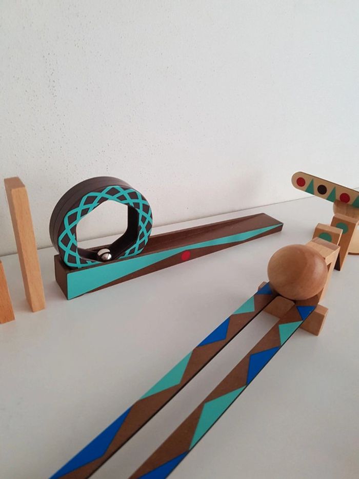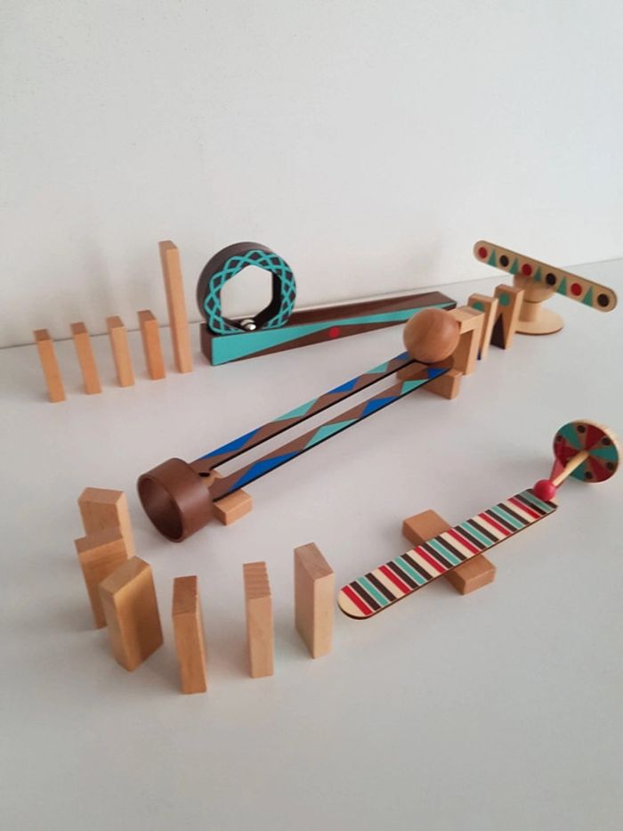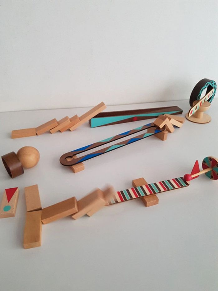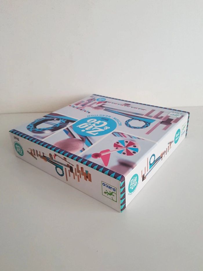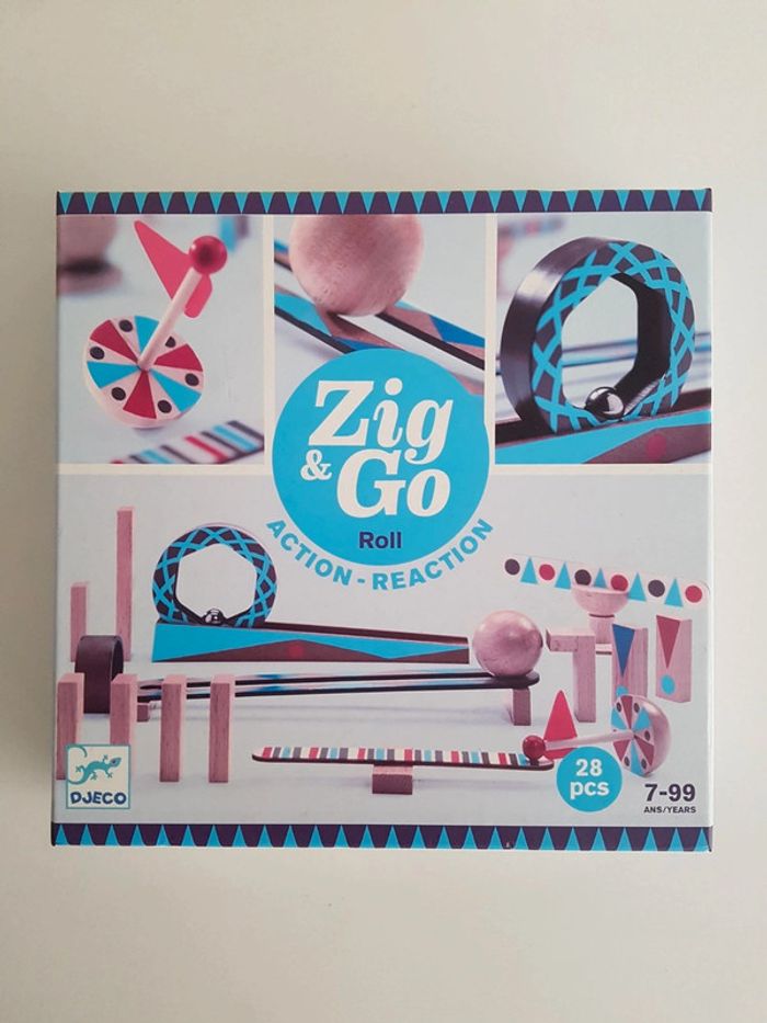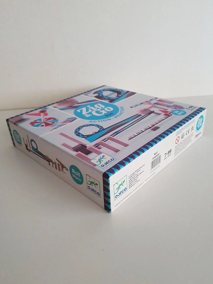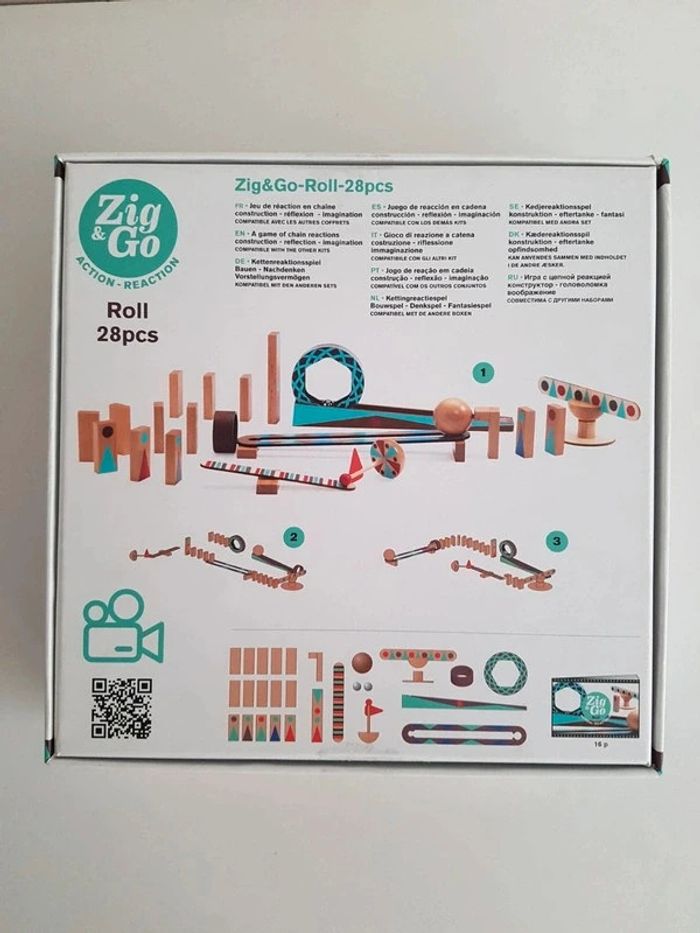 Zig and go roll action réaction de Djeco est un jeu en bois de réaction en chaîne de 28 pièces. Ce coffret est compatible avec les autres jeux de la gamme Zig&Go. Un set de construction pour assembler des circuits avec billes, bascule et dominos avec dextérité et équilibre pour développer l'imagination et la créativité. Imaginé par Jean-René Ménard avec des enchaînements loufoques, surprenants et spectaculaires. Un jeu éducatif pour comprendre l'ingéniosité d'une réaction en chaîne, apprendre la vitesse qui varie selon le poids d'un accessoire, évaluer les distances qui les séparent, prendre plaisir à construire des parcours et regarder la magie des mouvements qui s'enchainent jusqu'au moment où le circuit s'achève. COMPLET : 2 billes, 1 balle en bois, 15 dominos dont 5 colorés, 1 toboggan, 1 sphère, 1 tourniquet, 1 drapeau à bascule ... ,1 livret explicatif pas à pas avec 3 modèles fournis pour guider dans la réalisation des parcours. Hauteur des dominos : 5 cm