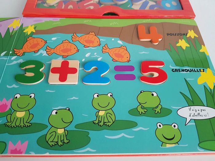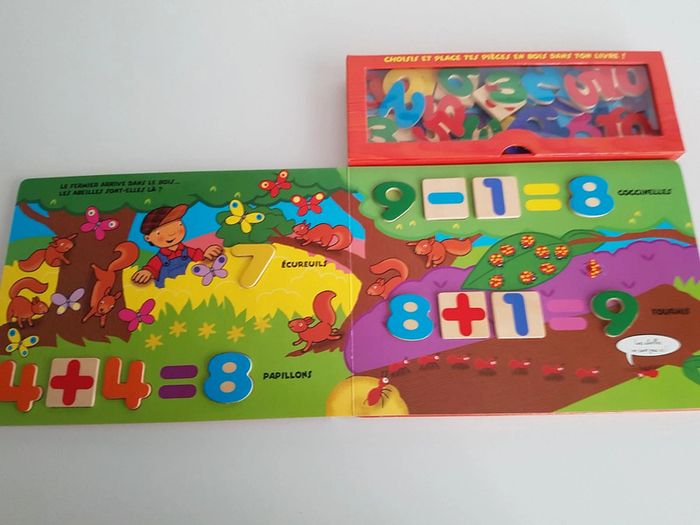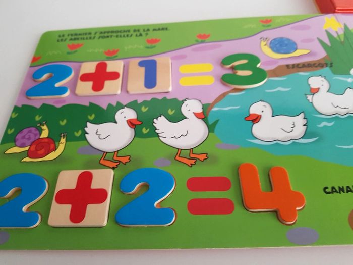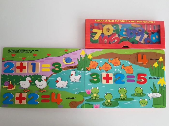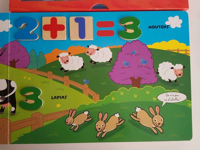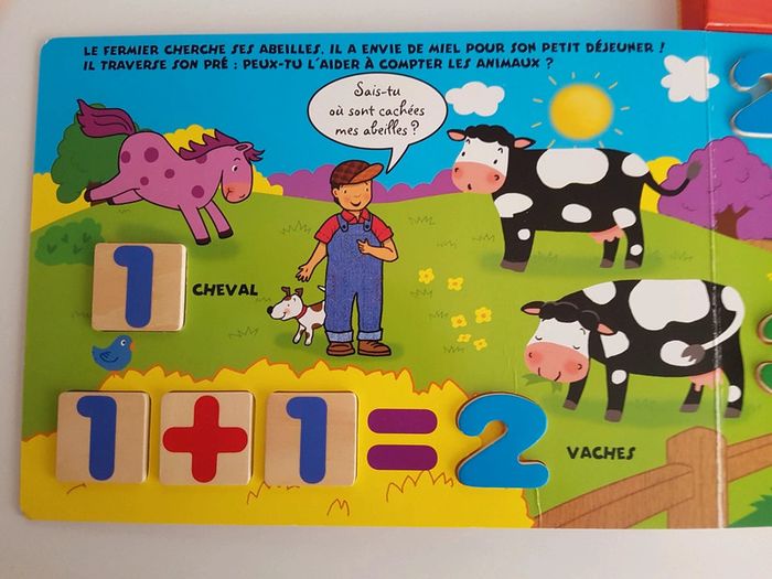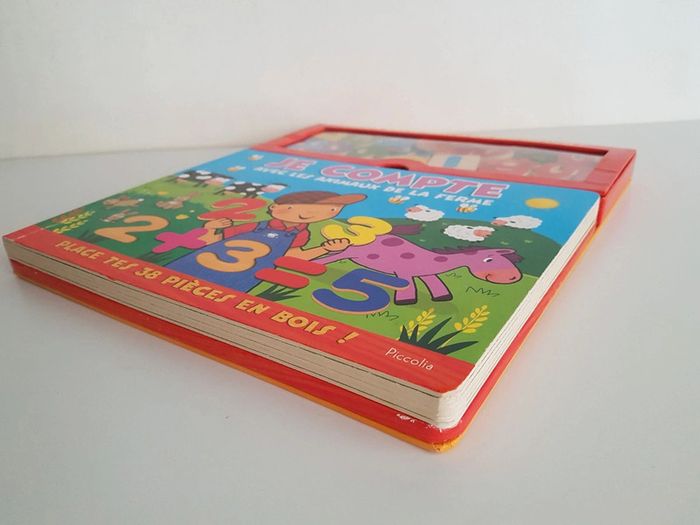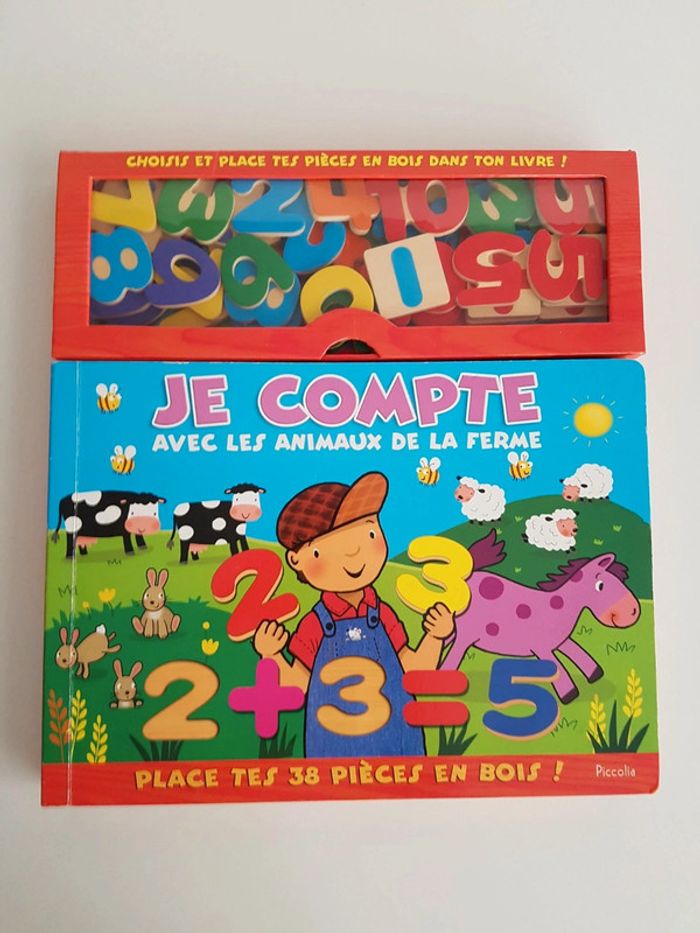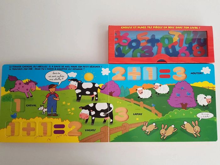 Grand livre Je compte avec les animaux de la ferme et 38 pièces en bois Collection livre puzzle découverte Un livre-jeu interactif et éducatif pour compter de 1 à 10 et s'initier au calcul Jouer avec les pièces en bois pour nommer et compter les abeilles du jardin, les moutons du fermier, les poissons de la mare, les écureuils de la forêt. Il suffit de reconnaître le chiffre demandé et de le placer dans sa forme. Éditions Piccolia Dimensions : 29 × 31,5 cm