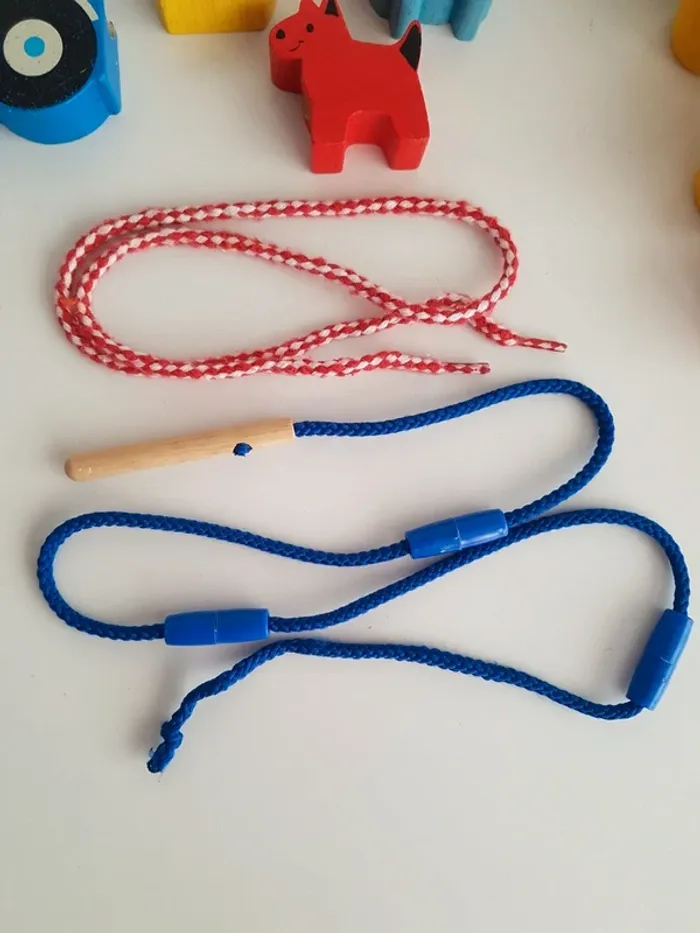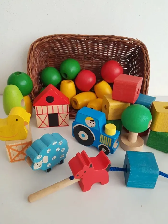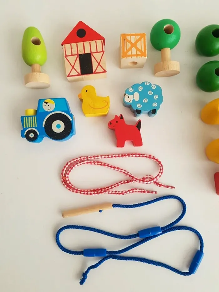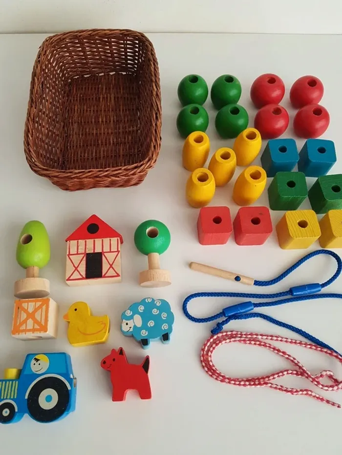 Lot de 28 perles à lacer en bois sur le thème de la ferme avec 1 lacet et 1 cordon avec aiguille en bois pour faciliter l'enfilage. Un jeu créatif montessori pour travailler la motricité fine avec des grosses perles en bois faciles à manipuler. • 20 perles colorées Un jeu de laçage ludique pour apprendre les couleurs (jaune, vert, bleu, rouge) et les formes (rond, carré...) • 8 grosses perles sur le thème de la nature et de la ferme 3 animaux : chien, mouton et canard Tracteur, barrière, maison, sapin et arbre • petit panier en osier pour ranger les perles Dimensions du panier : 15 × 22 cm Longueur aiguille en bois : 7 cm Largeur des perles carrées : 3 cm Hauteur du mouton : 4 cm