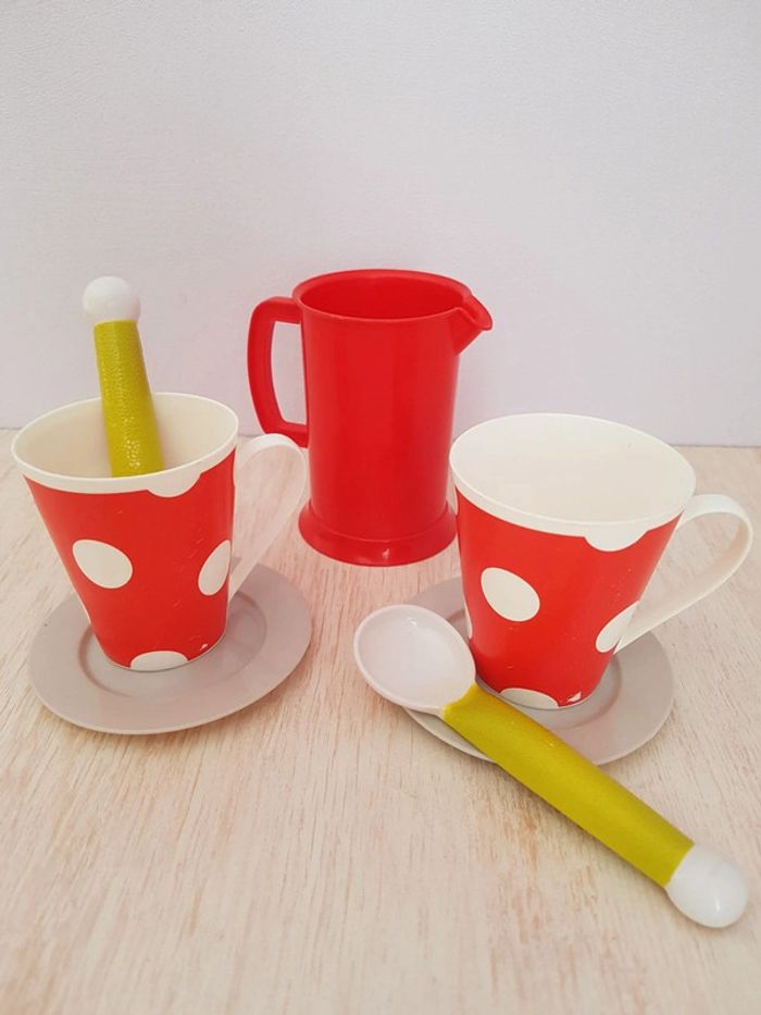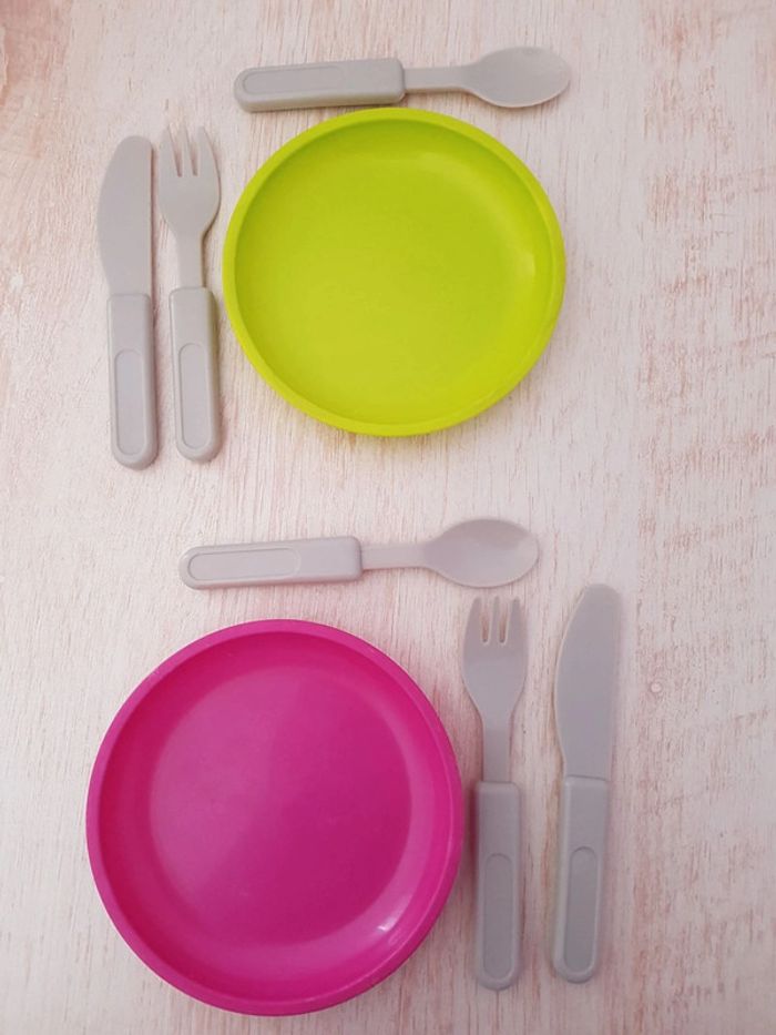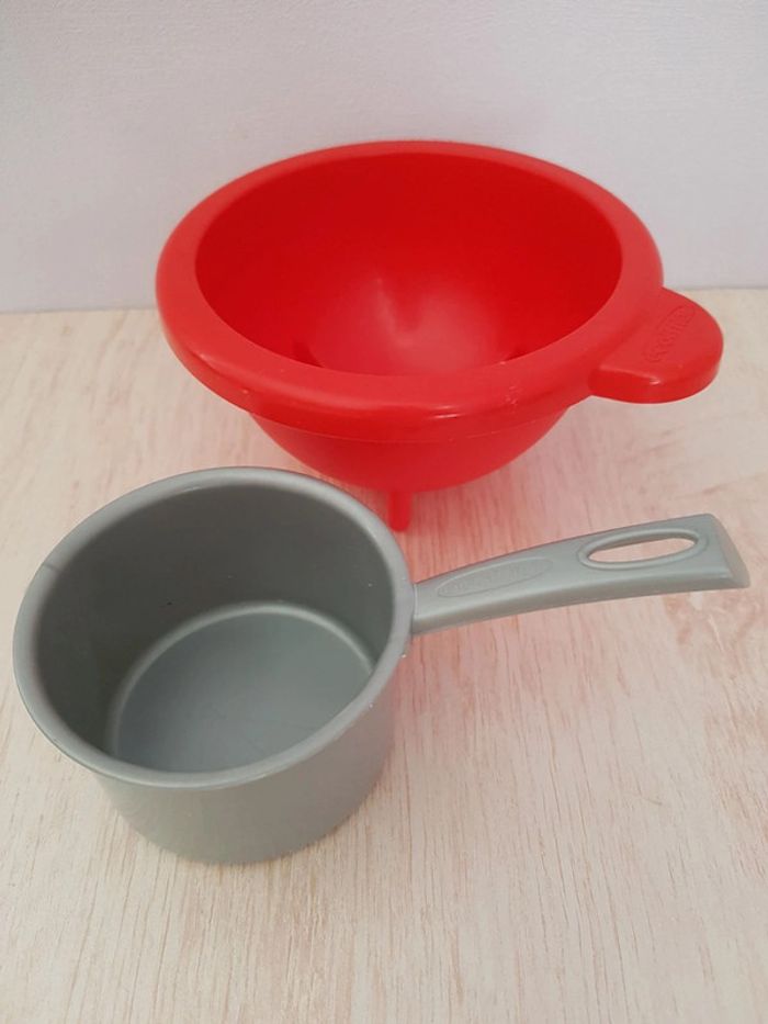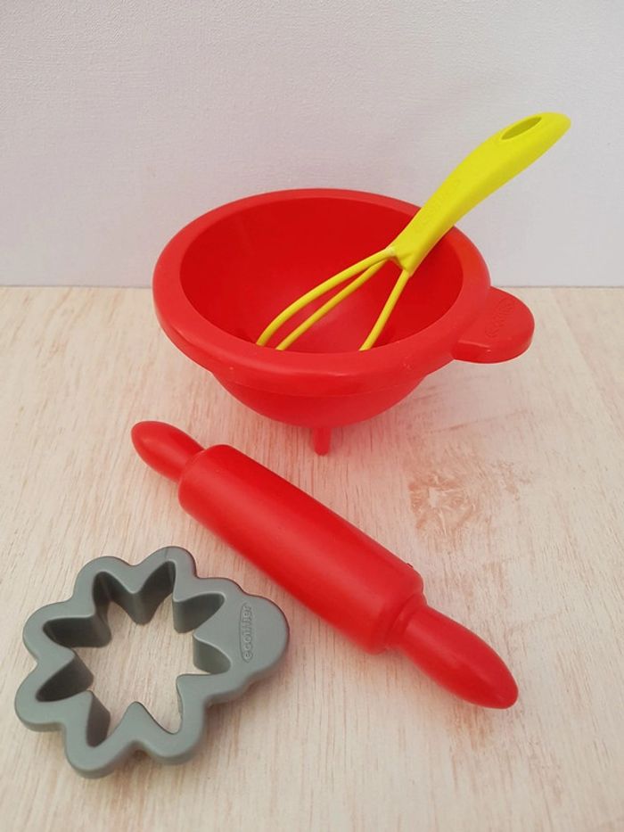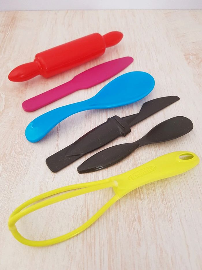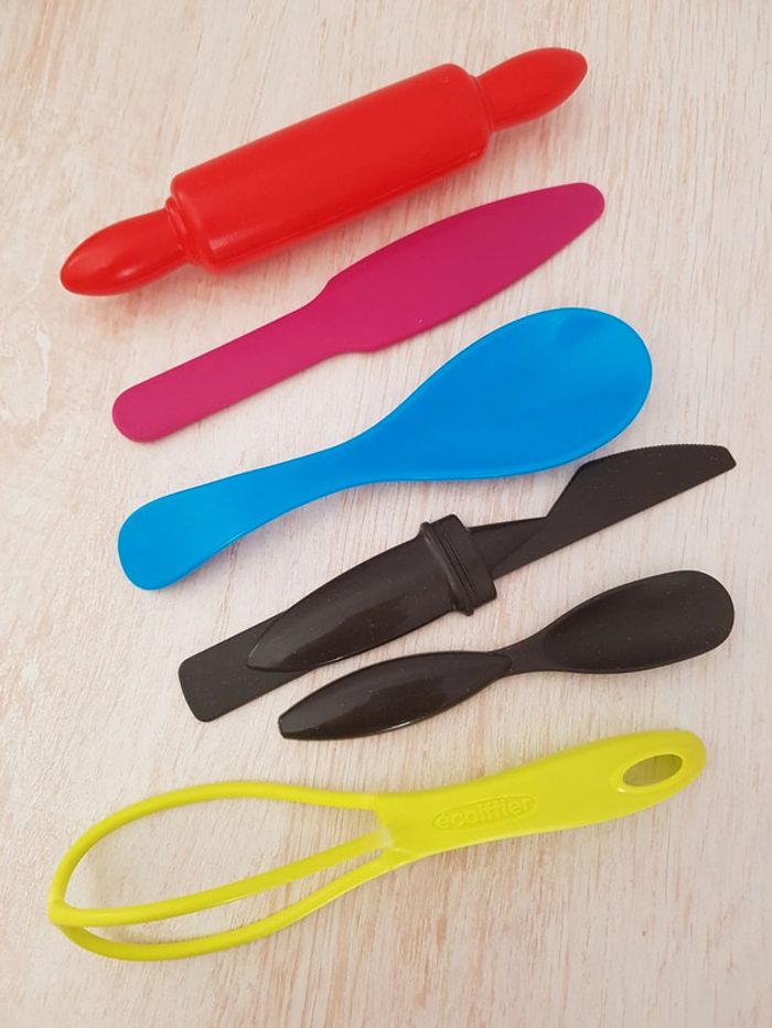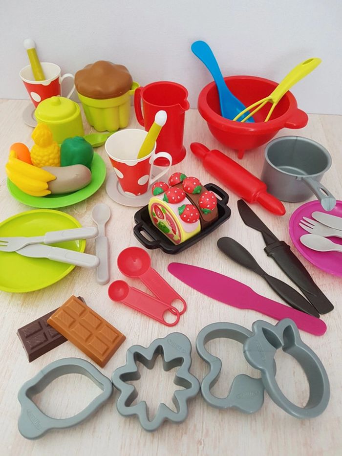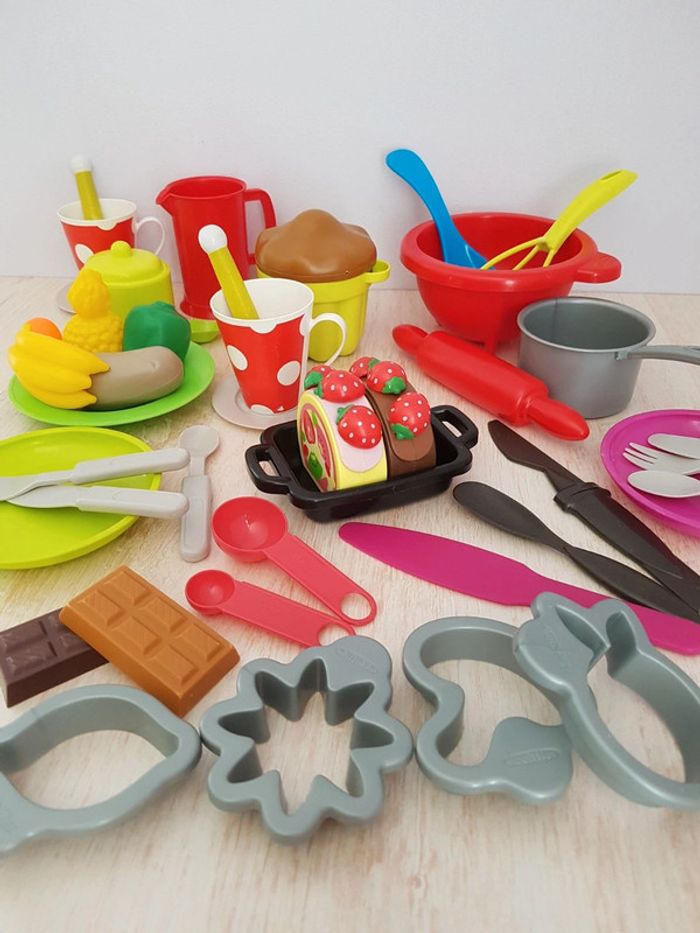 Accessoires de pâtisserie et lot de dînette en plastique pour jouer au restaurant et s'amuser à cuisiner comme les grands. Jeu d'imitation qui stimule la manipulation, la créativité et favorise le partage pour jouer à la marchande ou dans la cuisine. • Accessoires Écoiffier : 4 emporte-pièces, rouleau à pâtisserie, grand saladier, fouet (réparé, longueur 17 cm), carafe (hauteur 9 cm), 2 tasses à café, pot à sucre, plat à gâteau, casserole, moule et brioche • ustensiles de cuisine : louche, spatule, 2 cuillères doseuses, couverts, plateau, 2 assiettes, 2 coupelles • fruits et légumes : banane, ananas, carotte, poivron et pomme de terre • aliments : 2 tablettes de chocolat, 2 parts de bûches à décorer avec fraises