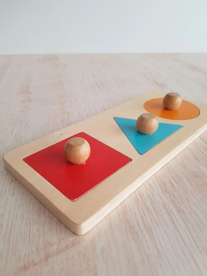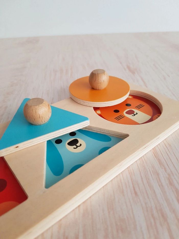 Lot de 2 jeux éducatifs en bois : • Puzzle forme 1.2.3 animaux Djeco Un puzzle trio à encastrement où il faut retrouver la bonne place des 3 pièces pour cacher ou découvrir les animaux (ours, chien et lion). Un jouet montessori pour encourager la réflexion, la motricité fine et la notion de tri : observation des formes en bois, manipulation, puis jeu d'encastrement pour insérer les pièces de formes différentes dans leur emplacement respectif. Idéal pour sensibiliser aux formes géométriques (carré, triangle, rond), et aux couleurs (rouge, bleu et orange) COMPLET : 1 plateau et 3 pièces avec tenon Largeur de la pièce carrée : 6 cm Dimensions du support : 22 × 9 cm • Jeu d'encastrement horizontal Un jouet d'éveil en bois pour encourager la précision des gestes COMPLET : 1 support et 3 disques Diamètre des anneaux : 5 cm