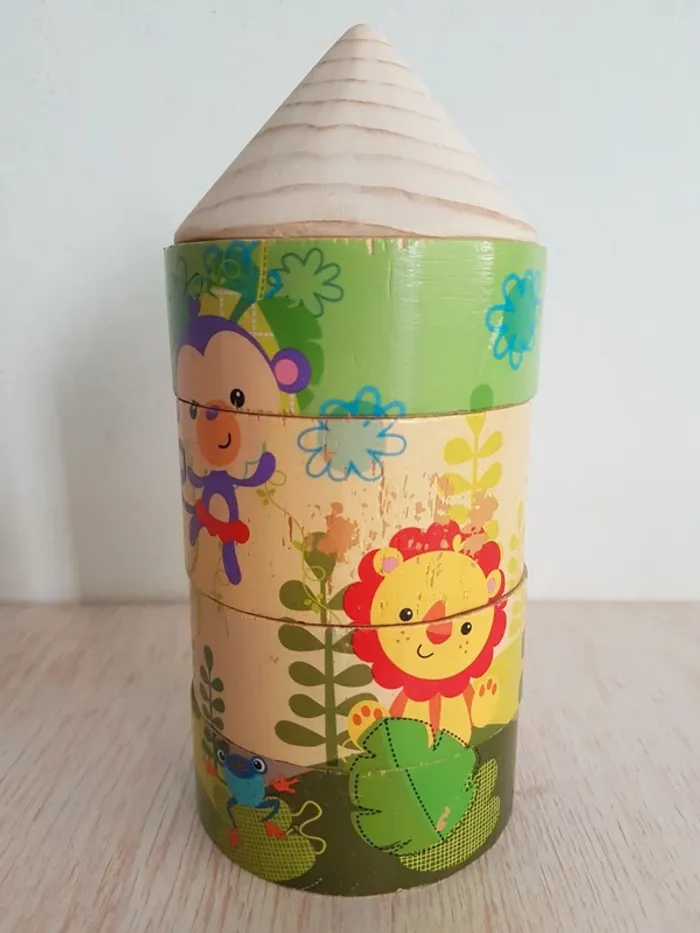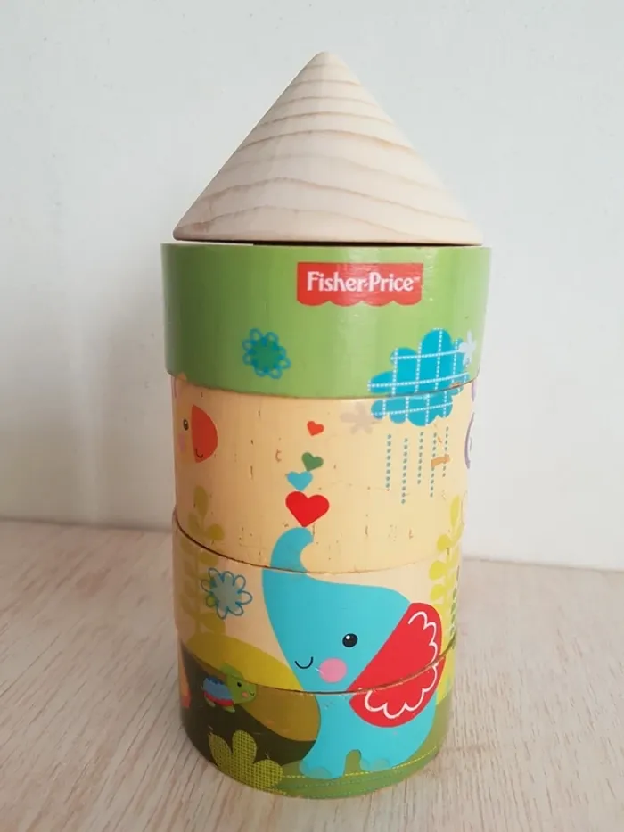 Lot de jouets d'éveil en bois • 14 blocs de construction (dont 11 pièces EverEarth) à manipuler et secouer pour développer le sens tactile et l'ouïe avec différents sons : billes, perles, clochette Un jeu éducatif montessori pour développer la la motricité fine, la notion de tri, découvrir les formes et les couleurs, encourager le sens du toucher et l'observation par la manipulation. Largeur des cubes : 4 cm • Oiseaux à visser Janod Un jouet de vissage avec des oiseaux sur leur perchoir Hauteur de l'oiseau rose : 7,5 cm • Tour d'emboîtement Fisher-Price À assembler en 8 parties avec 3 pièces géométriques à découvrir ou cacher en soulevant les pièces. Jeu empilable usé Hauteur : 17 cm Diamètre : 8 cm • 2 grosses voitures colorées Boikido Peinture des véhicules abîmée Longueur : 8 cm