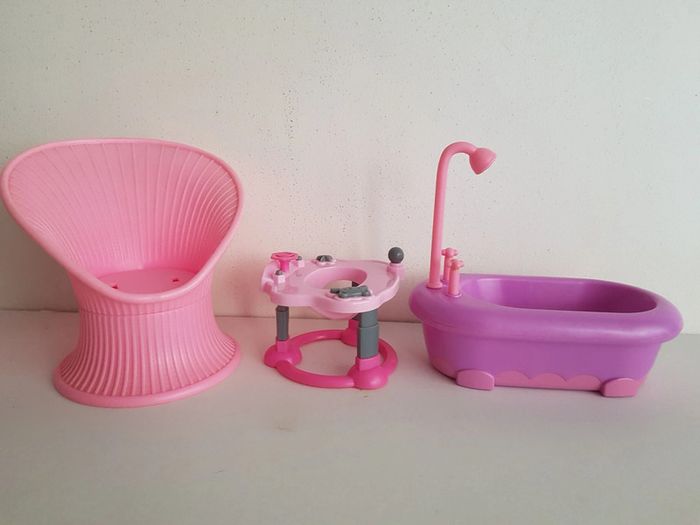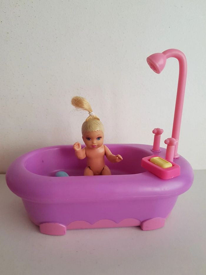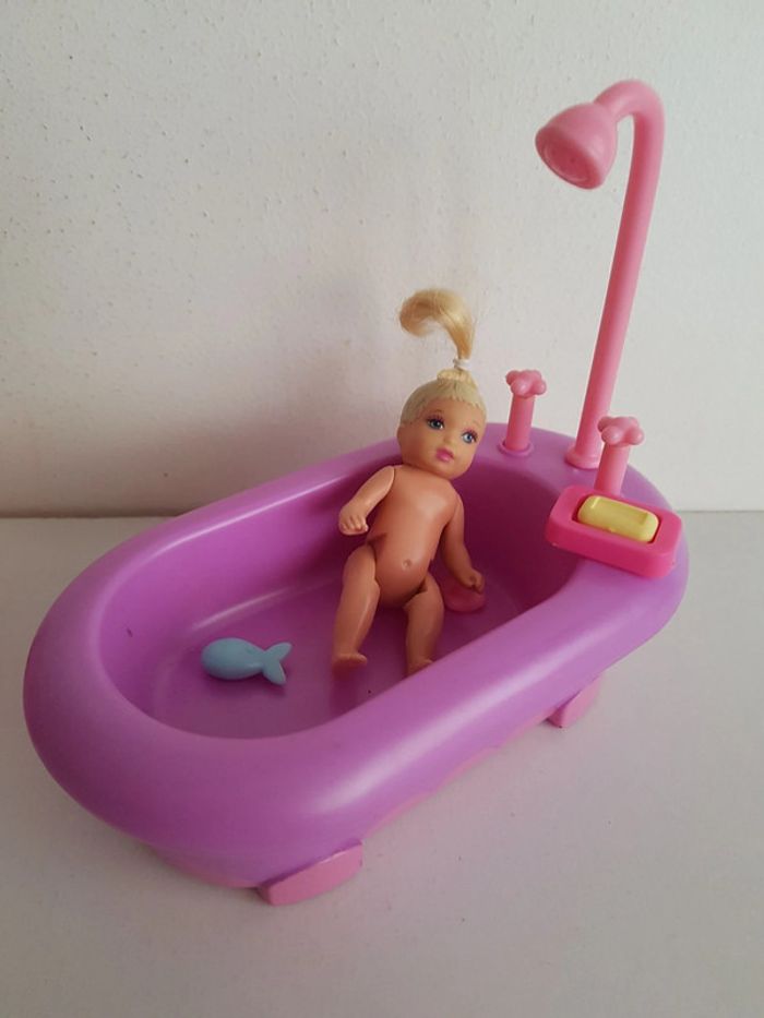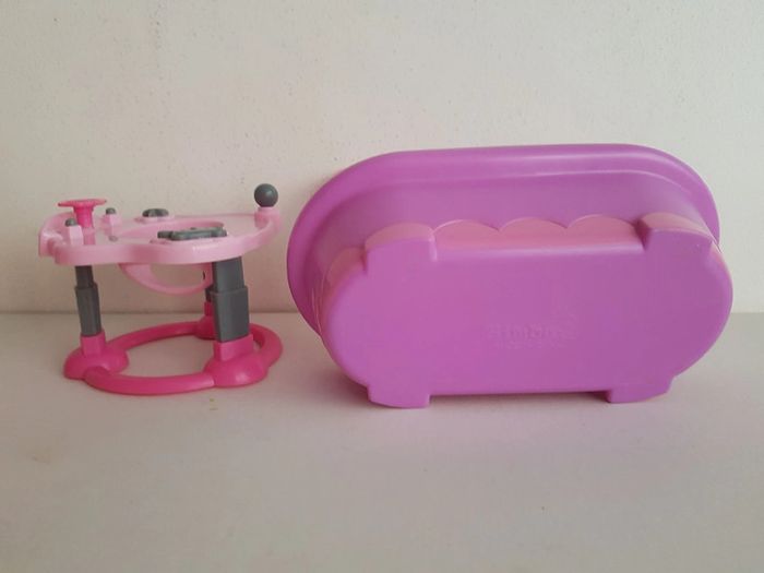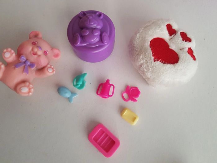 Beaucoup d'accessoires : ours, poisson pour le bain, porte-savon et savonette, biberoxn, hochet