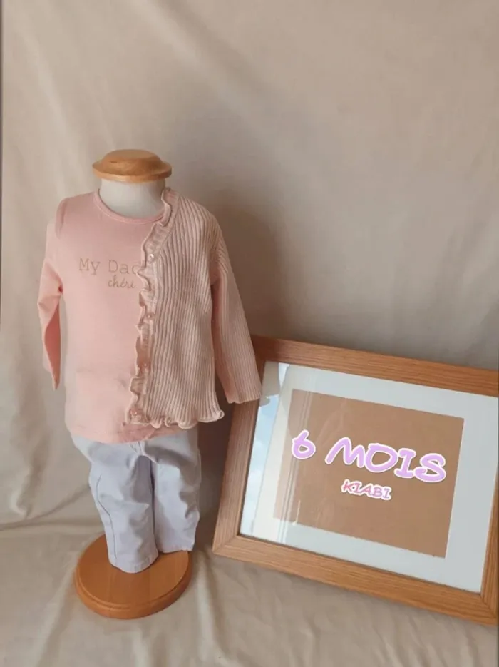 🗃️ Gilet, tee-shirt manches longues et pantalon 📏 Taille 6 mois 🔖 Marque Kiabi 🎨 Coloris lilas et rose 📌 Très bon état (gilet neuf sans étiquette) 📝 Informations complémentaires : Gilet à boutons avec froufrous au niveau de la fermeture sur le devant. Jamais porté Tee-shirt manches longues avec inscription "my daddy chéri" sur la poitrine Pantalon lilas taille élastique et resserrable par boutons à l'intérieur de la ceinture ☀️ Remises activées dès 2 articles achetés 🆕 Nouveautés ajoutées régulièrement sur le dressing 📦 Envoi rapide et soigné #Marjoriedu76170Lison6mois #kiabi6moisfille #6moisfille #ensemble6moisfille