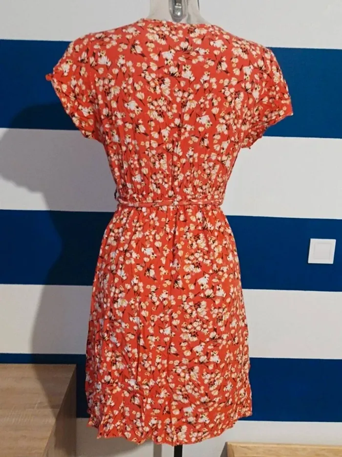 Magnifique robe courte et sa ceinture assortie rouge orangé fleurie femme taille 38/40 - photo numéro 3