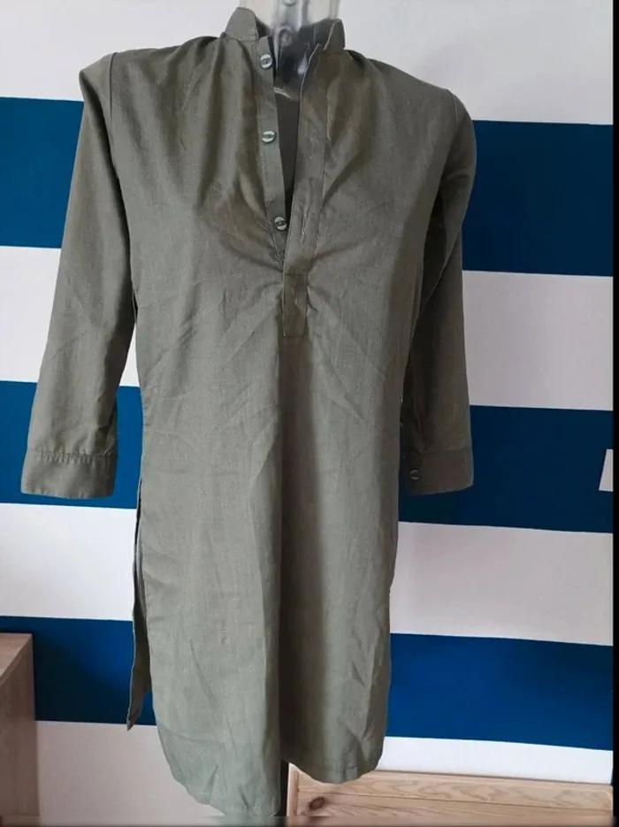 Tunique longue de style traditionnel, confectionnée dans un tissu léger de couleur kaki/vert olive. Elle possède des manches longues et une encolure tunisienne, qui s’ouvre sur le devant avec une patte de boutonnage partielle munie de trois boutons. Le col est droit et légèrement montant, apportant une touche élégante à l’ensemble. Les manches se ferment également avec un bouton au niveau des poignets. La coupe est droite, avec des fentes latérales en bas, offrant une liberté de mouvement et un style décontracté. Cette tunique peut être portée aussi bien dans un contexte décontracté que semi-formel, souvent associée à des vêtements traditionnels ou comme vêtement d'intérieur confortable. #Marjoriedu76170femme36 #taille36femme #tunique36femme