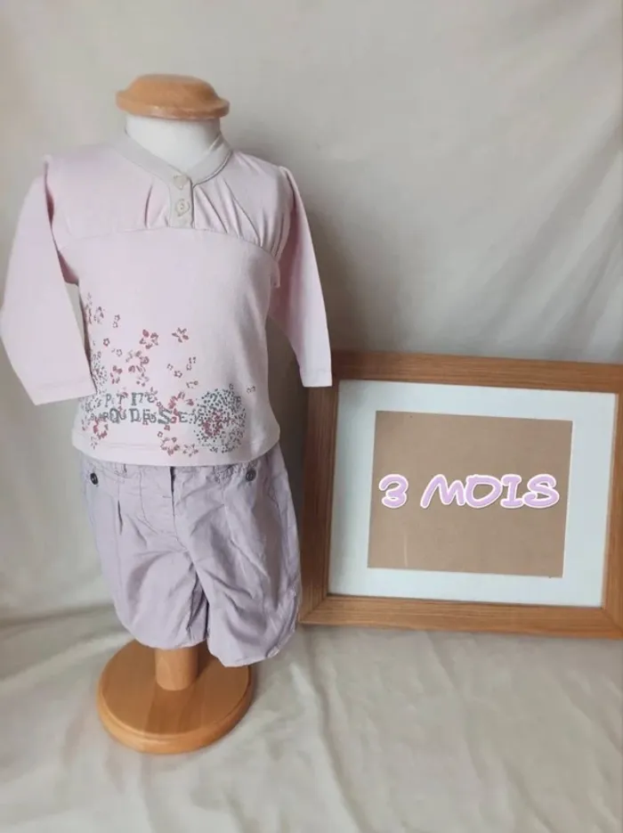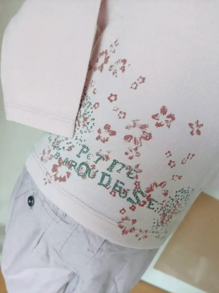 👕👖 Tee-shirt Manches Longues & Pantacourt Lilas 👖👕 Cet ensemble comprend un tee-shirt à manches longues et un pantacourt lilas, idéal pour toutes les occasions. 👕 Le Tee-shirt : * Couleur : Rose pâle doux, rehaussé d'un col gris clair et de boutons assortis. * Design : Imprimé délicat de motifs floraux et de l'inscription "PETITE BAROUDEUSE" ajoutant une touche de fantaisie. * Confort : Manches longues pour garder bébé bien au chaud, idéal pour les mi-saisons ou les journées plus fraîches. 👖 Le Pantacourt : * Couleur : Lilas tendre, une teinte douce et tendance. * Détails : Fermeture boutonnée et plis subtils sur le devant pour une coupe confortable et stylée. Les boutons décoratifs ajoutent une touche d'élégance. * Praticité : Sa longueur pantacourt est parfaite pour la liberté de mouvement de bébé tout en restant couverte. Cet ensemble est un choix charmant et pratique pour la garde-robe de votre bébé, combinant douceur, confort et un look irrésistible. #Marjoriedu76170Lison3mois #ensemble3moisfille #3moisfille