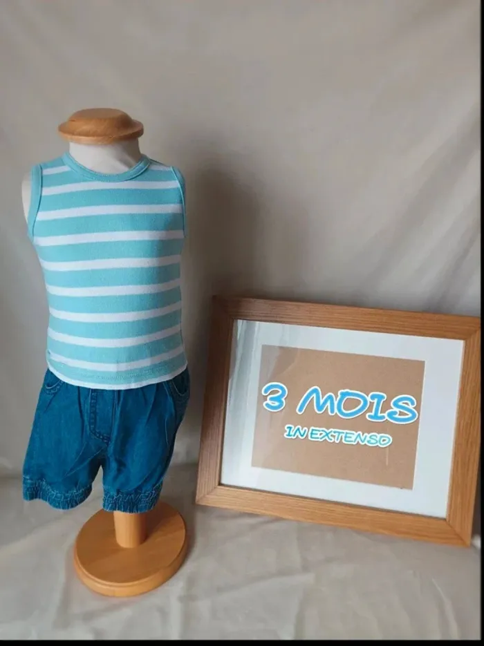 Le débardeur, aux rayures horizontales bleu ciel et blanches, offre un style frais et estival. Sa coupe sans manches assure confort et liberté de mouvement. Le sarouel effet jean, d'un denim doux et souple, est doté d'une taille élastiquée et de bas de jambes resserrés pour un ajustement parfait et un confort optimal. Cet ensemble est idéal pour les journées ensoleillées, alliant style et praticité pour bébé. #Marjoriedu76170Nanou3mois #ensemble3moisgarçon #inextenso3moisgarçon #3moisgarcon